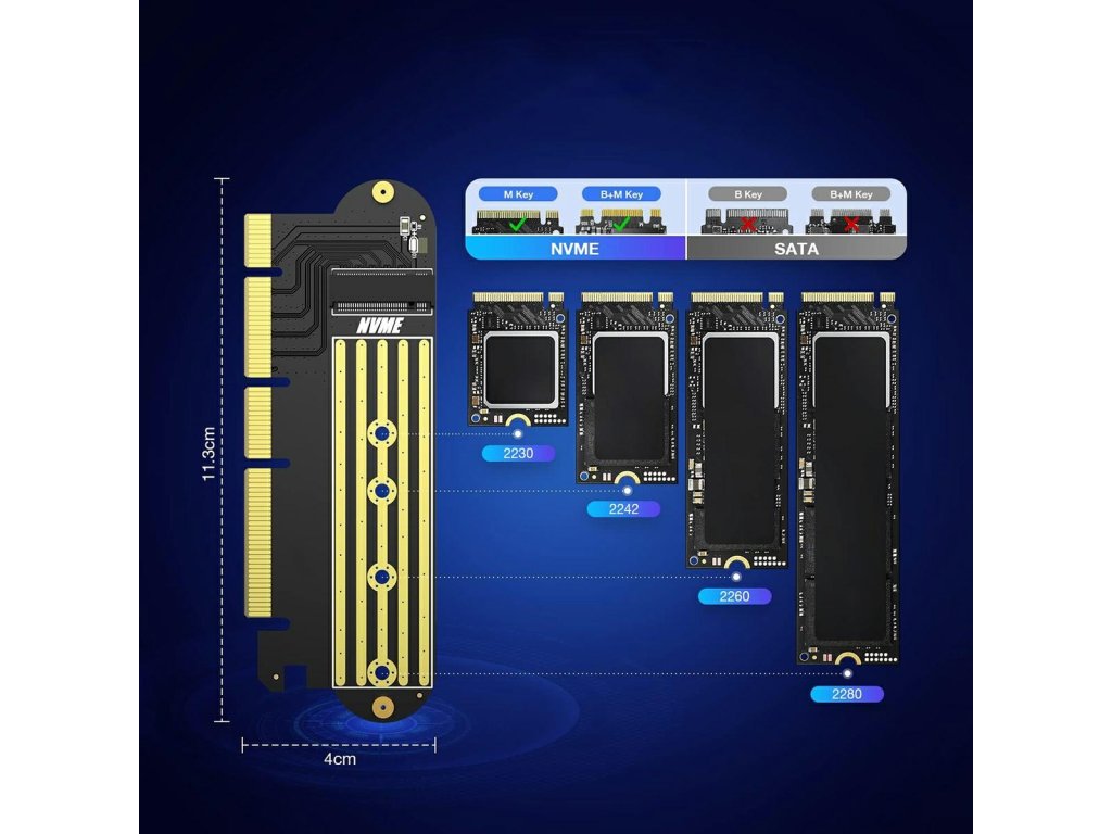 - Diskový adaptér M.2 NVMe (klíč M / klíč M+B) připojený ke slotu PCI-e x1 na základní desce.
