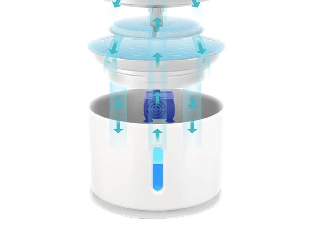 Automatická napáječka pro domácí mazlíčky. Atraktivní konstrukce ve tvaru fontány s několika tryskami. Velká nádrž na vodu s kapacitou až 2,4 litru zajišťuje dlouhodobé používání. Filtrační systém (s vyměnitelným filtrem) poskytuje čerstvou a čistou vodu pro našeho mazlíčka. Zavlažovač je vybaven tichým a účinným čerpadlem, zařízení může úspěšně pracovat i v noci. Bezpečnost používání zvyšuje funkce automatického vypnutí a indikace nízké hladiny vody (prostřednictvím LED podsvícení).