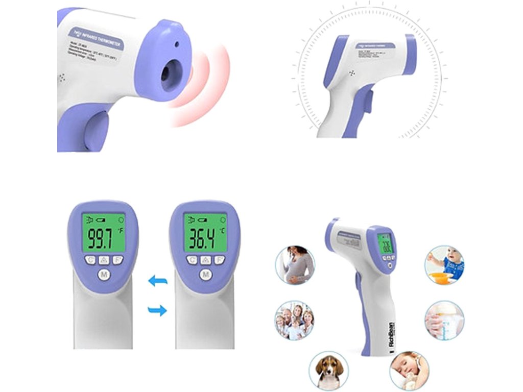 Elektronický, bezkontaktní infračervený teploměr určený pro celou rodinu. Produkt je určen zejména pro měření tělesné teploty u malých dětí - je extrémně rychlé a neinvazivní. Měření teploty se provádí méně než 2 sekundy po přiblížení zařízení k čelu. Dítě se mu ani nestihne věnovat, což rozhodně usnadňuje kontrolu teploty. Vybaveno přehledným LCD displejem, který mění barvu v závislosti na úrovni teploty. Dítěti můžete snadno změřit teplotu, když spí – bez zbytečného stresu a pláče. Extrémně snadné a intuitivní použití - je to levná a pohodlná alternativa ke standardním teploměrům!