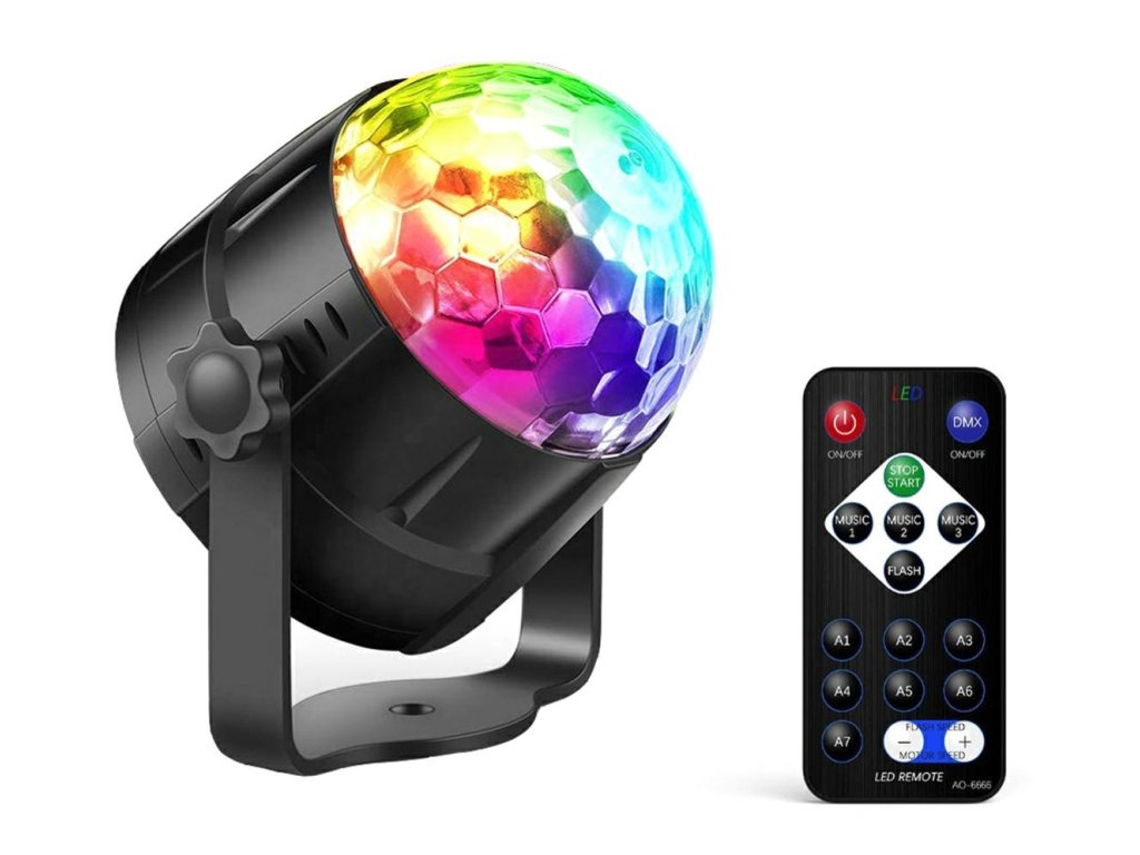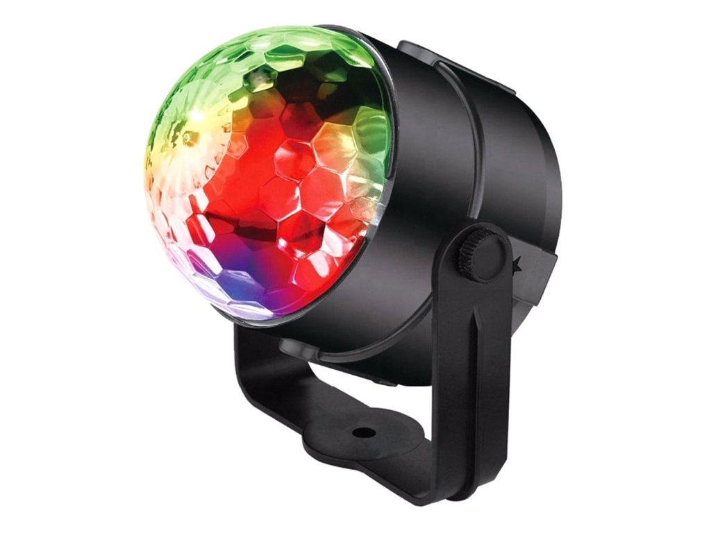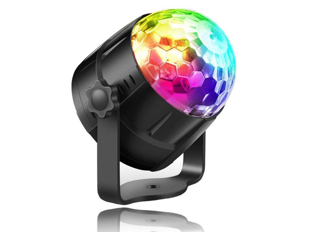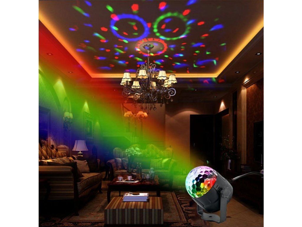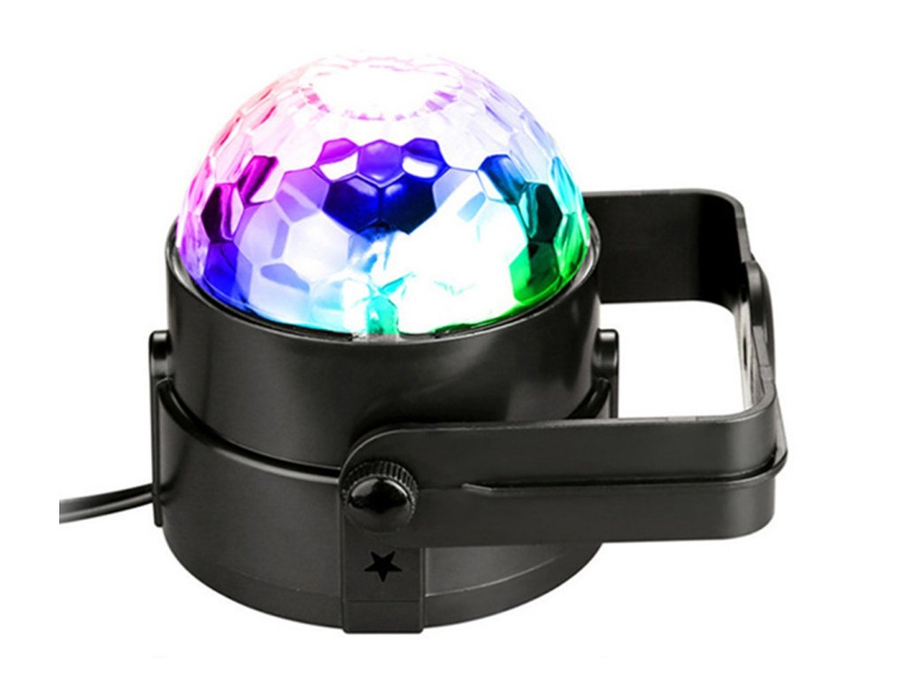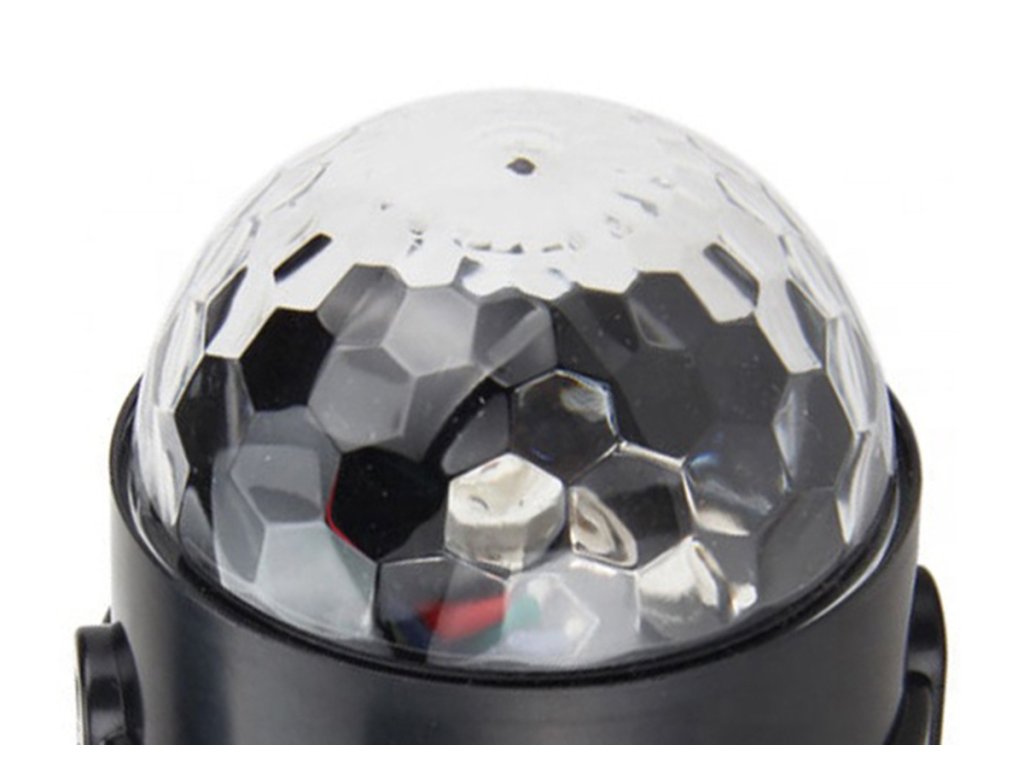 RGB LED disko koule vybavená zvukovým senzorem. Má až 7 různých režimů svícení v různých barevných kombinacích. Zařízení se ovládá tlačítky na panelu nebo dálkovým ovladačem. Je vybaven až 3 výkonnými LED diodami různých barev (červená, modrá a zelená). Úžasné světelné efekty zajišťuje vestavěný motor, který otáčí diody, a zvukový senzor, který umožňuje diodám blikat do rytmu přehrávané hudby. Ideální pro všechna hudební místa - diskotéky, kluby, hospody. Skvěle se bude hodit i do místnosti hudebního milovníka a při pořádání speciálních akcí, domácích večírků nebo při podpoře práce DJů.