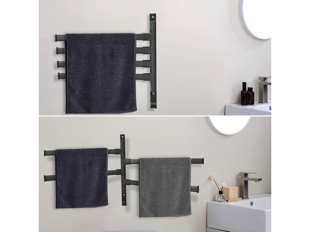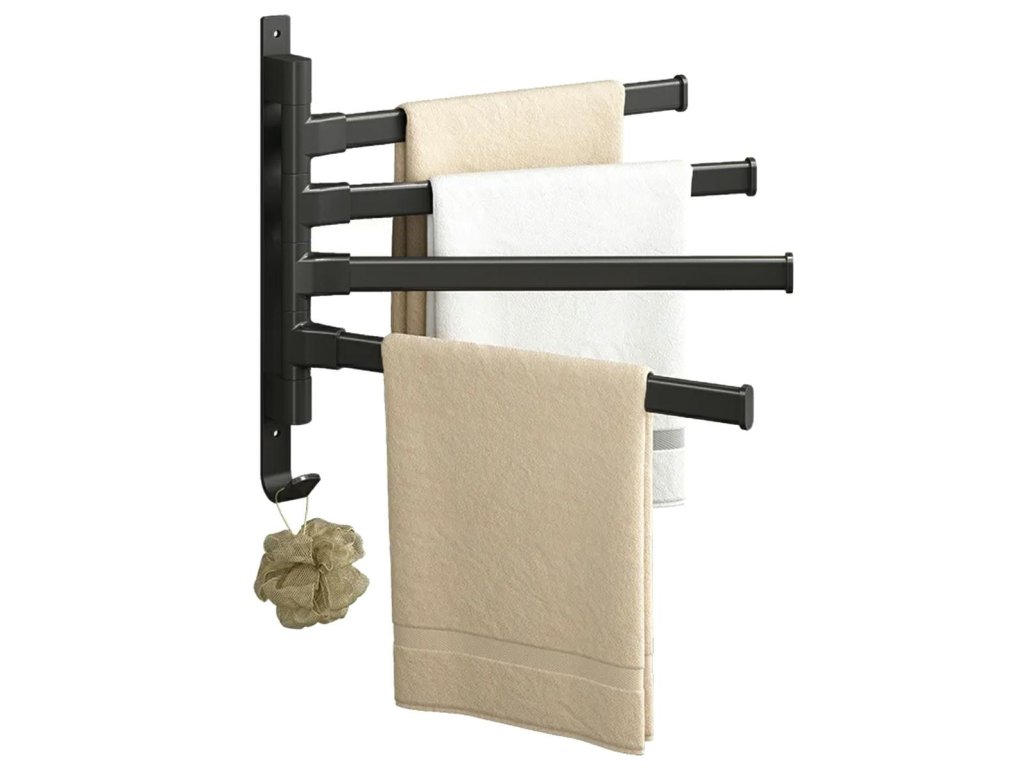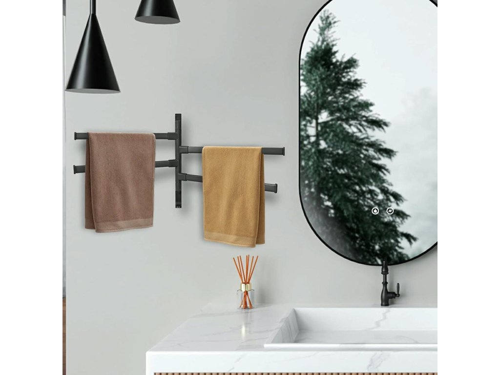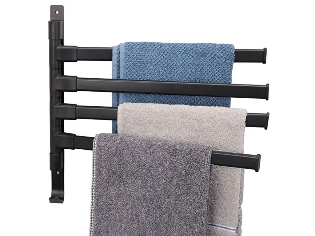 - Držák má čtyři nastavitelná ramena pro zavěšení ručníků.