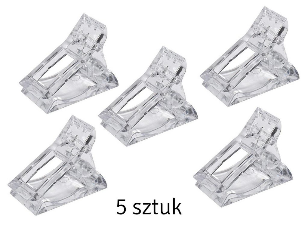 Sada pěti praktických, opakovaně použitelných spon na prodlužování nehtů. Navrženo pro profesionální použití a v typických domácích podmínkách. Spony jsou dobře profilované, nelámou a nestříhají nehty, výrazně zvyšují komfort a rychlost práce. Jsou perfektní pro úpravu nehtů technikou akrylového gelu, což usnadňuje udržení šablony na nehtové ploténce.