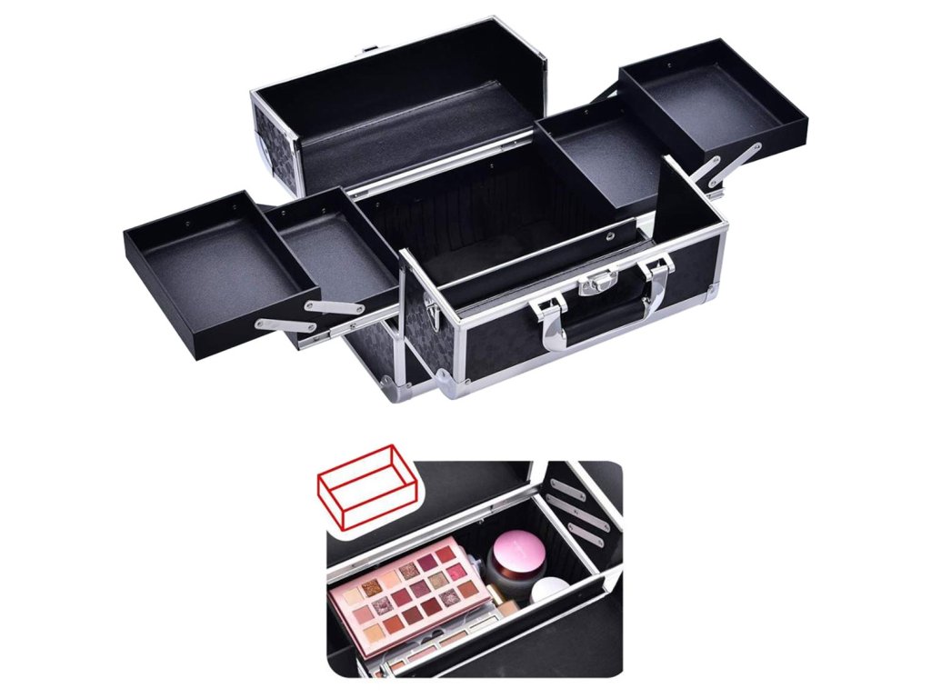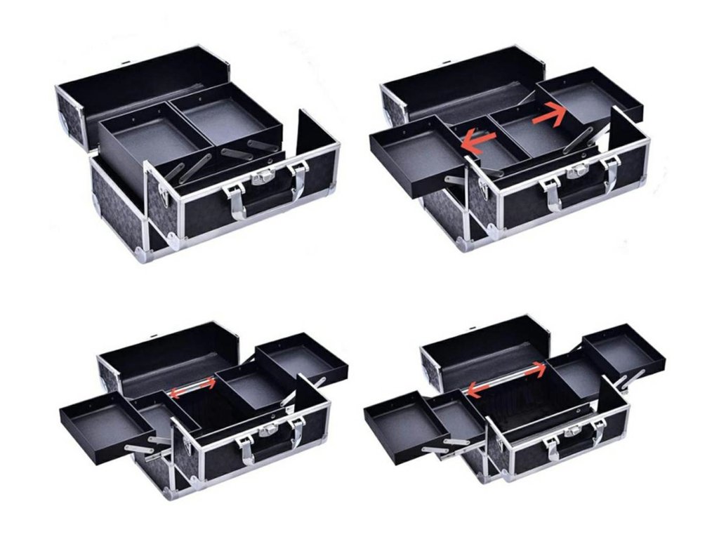 Praktické pouzdro pro přepravu a uložení kosmetiky nebo jiných drobností. Pouzdro s pevnou konstrukcí ochrání vaši kosmetiku před poškozením mnohem lépe než tašky a batohy. Nezbytné vybavení pro kosmetičky a stylistky, otevírá se z obou stran. Vybaveno 4 skládacími policemi a prostornou hlavní přihrádkou, potaženou měkkým materiálem, který chrání obsah uvnitř.