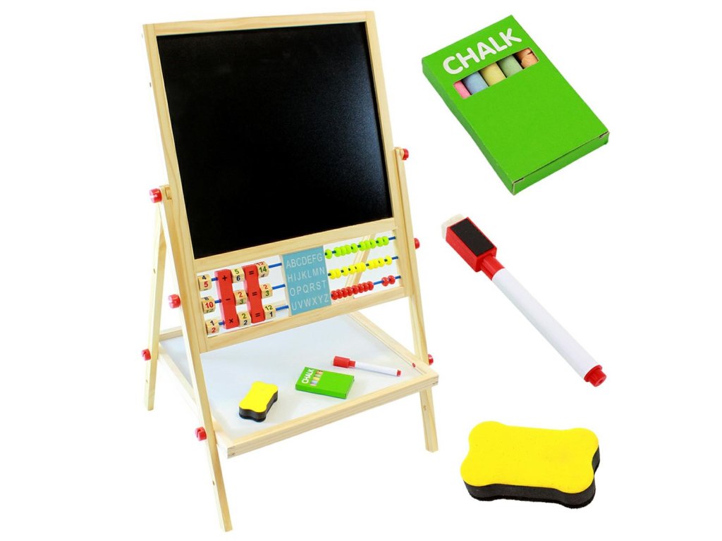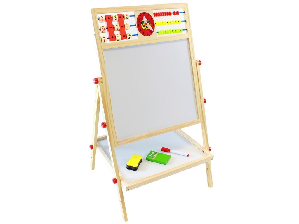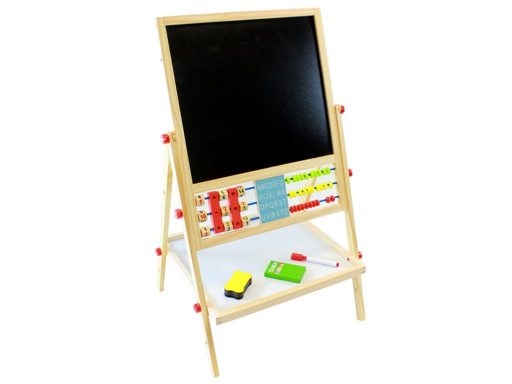 Oboustranná tabule (křídová a magnetická) vybavená přídavným počítadlem a dalším příslušenstvím. Skvělá hračka pro vaše děti! Díky moderní otočné desce u vás doma zůstanou stěny, dveře, nábytek nebo jiné předměty, na které vaše dítě tak rádo maluje, v perfektním stavu. Sada dále obsahuje magnetický popisovač na tabuli, krabičku s barevnou křídou, gumu, abecedu a počítadlo s hodinami na hraní.