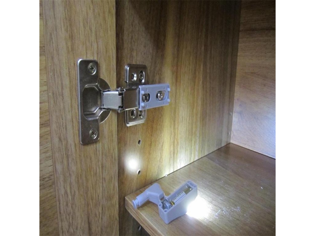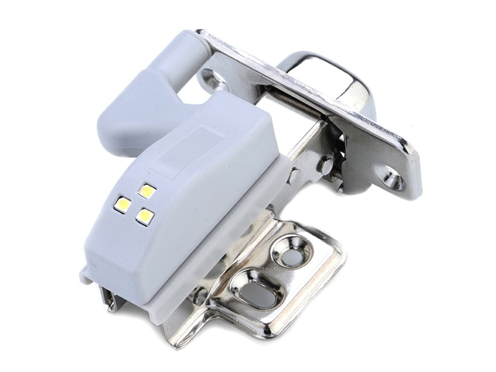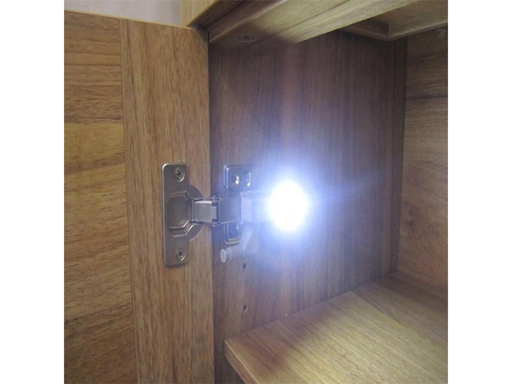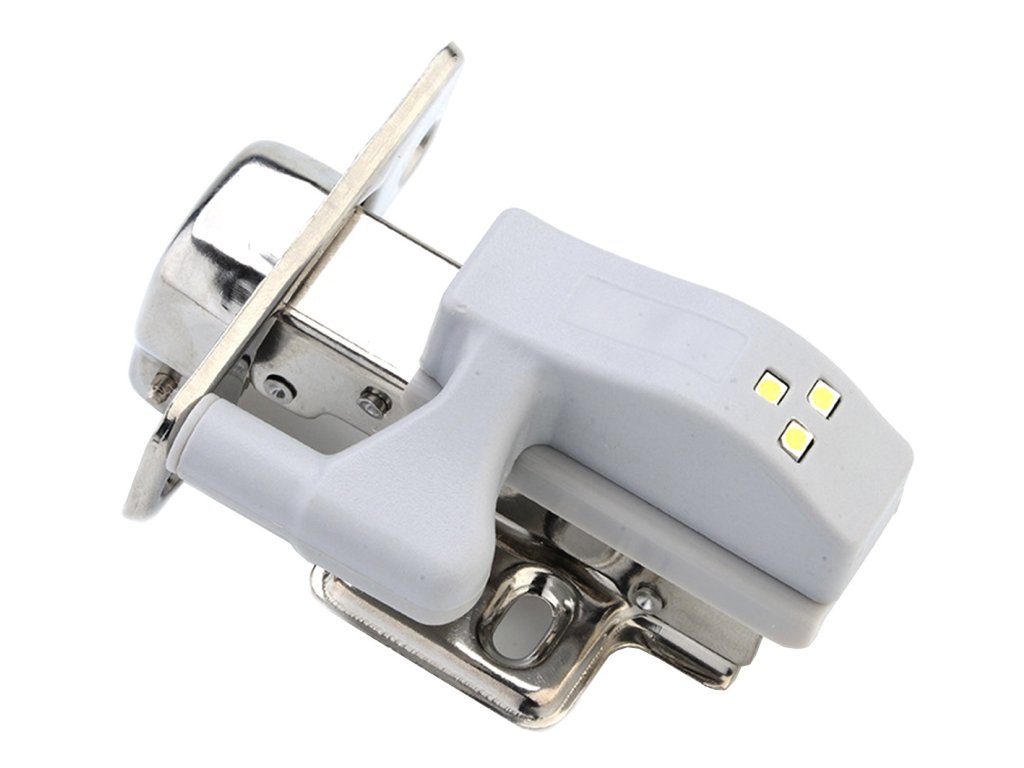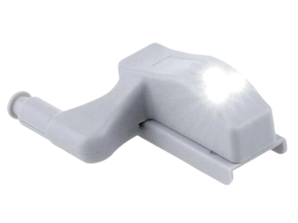 Kompaktní LED lampa pro montáž na pant uvnitř skříňky. Univerzální držák na panty (součástí balení). Je napájen 1 baterií A23, která zajišťuje dlouhou životnost. Vybaveno 3 jasnými a energeticky úspornými LED diodami s funkcí automatického zapnutí a vypnutí při každém otevření a zavření skříňky.