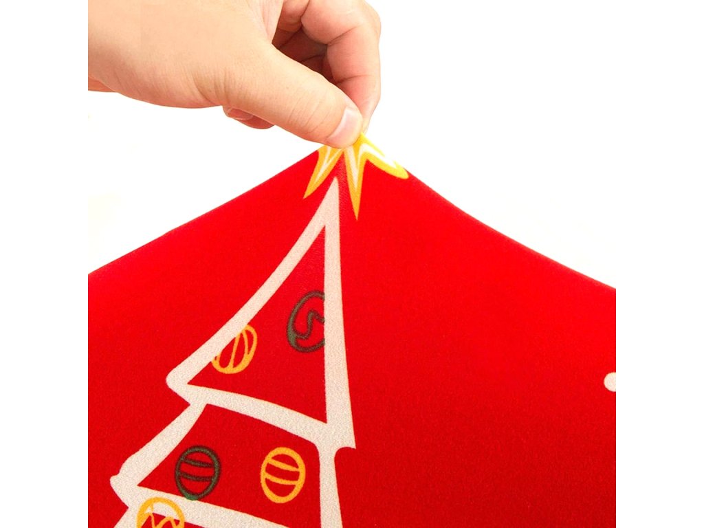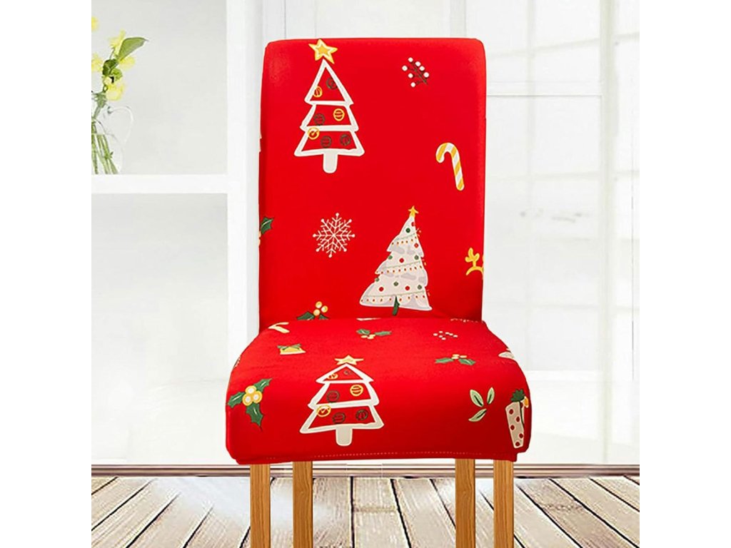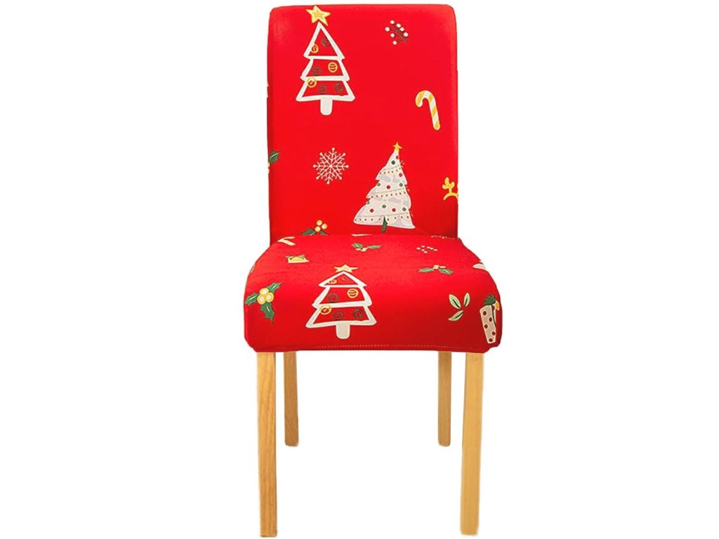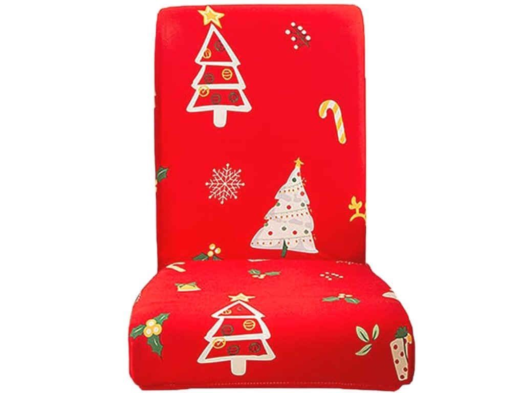 Univerzální potah na židli. Vyroben z měkkého materiálu připomínajícího samet. Díky vysoké pružnosti se snadno nasazuje na sedák a opěradlo různých typů židlí. Lze prát v pračce (na 30 stupňů Celsia). Atraktivní motiv vánočního stromečku.