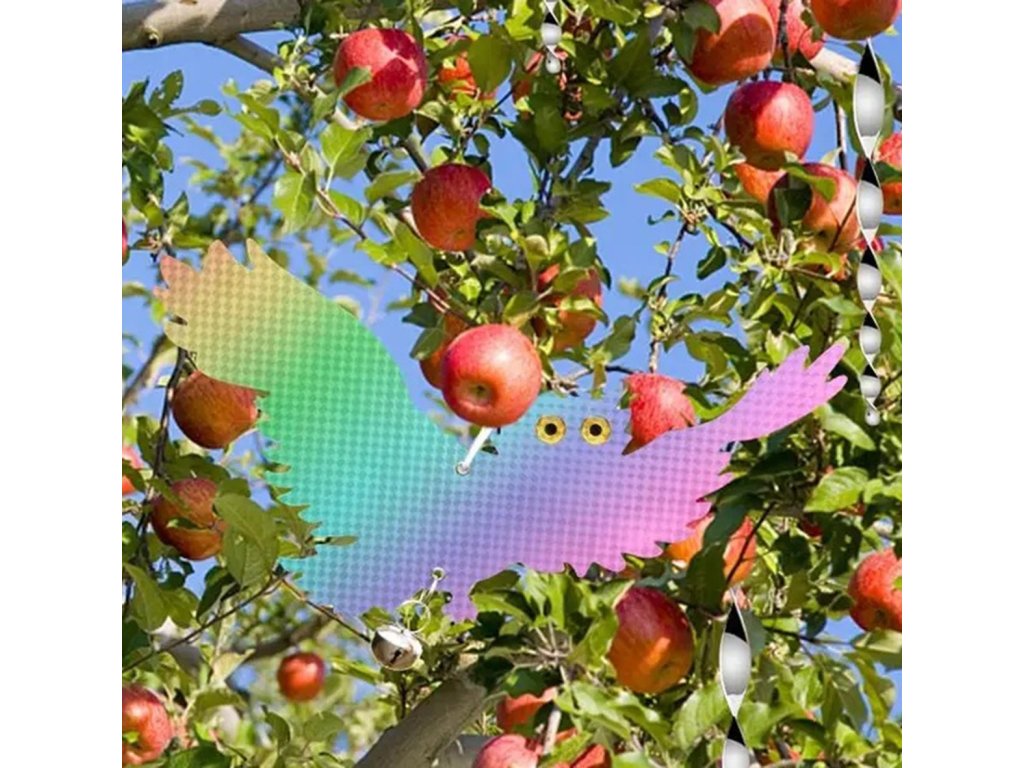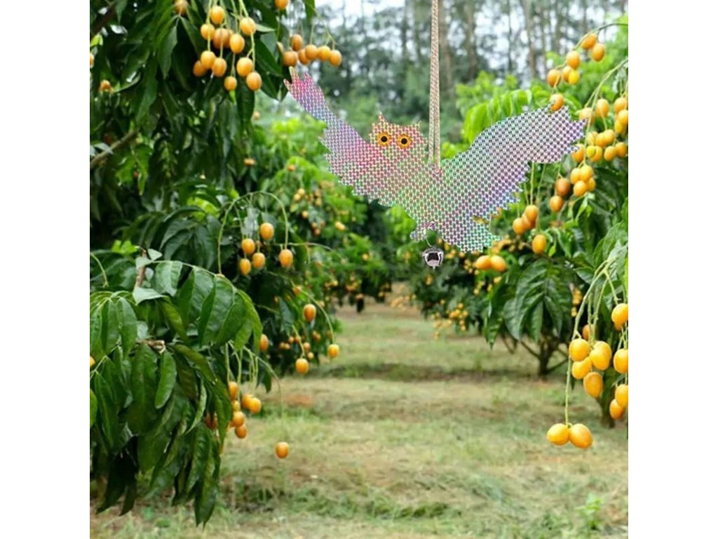 Reflexní odpuzovač ptáků ve tvaru létající sovy. Dokonale odpuzuje nežádoucí ptáky díky holografickému povlaku, který působí dojmem trojrozměrnosti. Vybaveno dvěma dalšími zvonky na dně, které zvyšují odstrašující účinek. Výrobek je určen k zavěšení na vyhrazený provázek v horní části. Je ideální pro ochranu plodin a domácích zahrad.