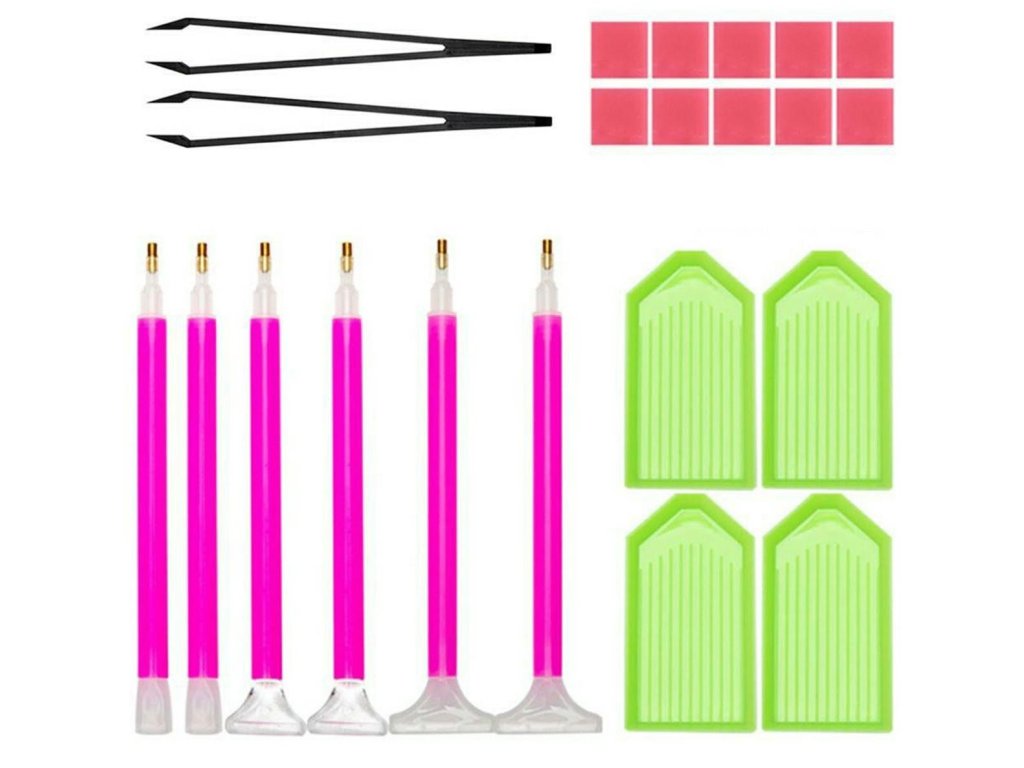 Sada 22 doplňků pro vyšívání / diamantové malování. Kompletní sada pro zahájení vašeho dobrodružství s diamantovými mozaikami. Sada obsahuje 6 per s různými hroty, 2 pinzety, 4 diamantové tácky a 10 čtverečků lepidla.