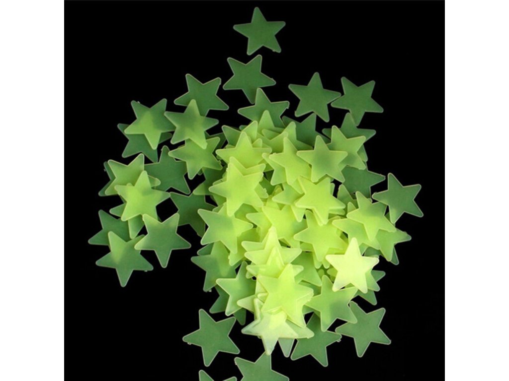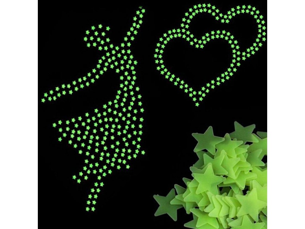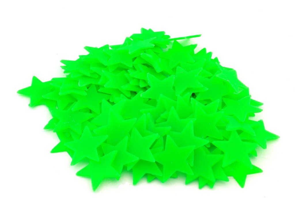 Sada 100 fluorescenčních hvězd. Hvězdy pohlcují světlo, a proto ve tmě září. Jsou ideální pro zdobení dětského pokoje (například na strop). Snadná instalace na jakýkoli povrch díky použití oboustranných samolepek.