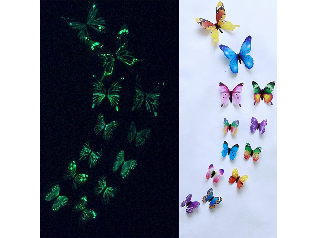 Sada 12 fluorescenčních motýlů v různých barvách. Dekorace absorbují světlo, a proto ve tmě svítí. Skvěle se hodí k dekoraci dětského pokoje (např. na zeď). Možnost nastavení křídel do libovolné polohy. Snadná instalace na jakýkoli povrch díky použití oboustranných samolepek.