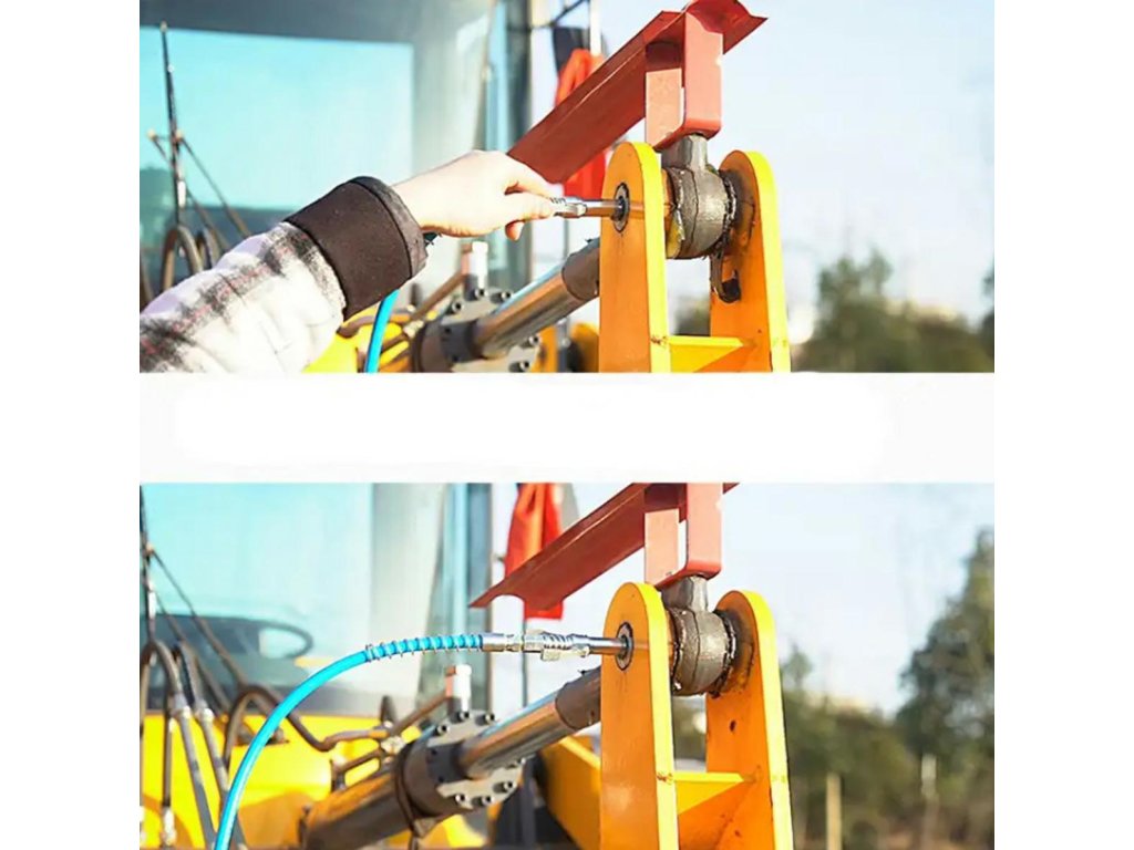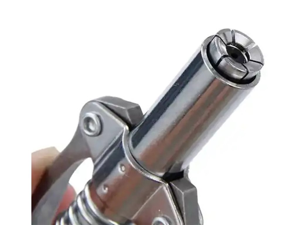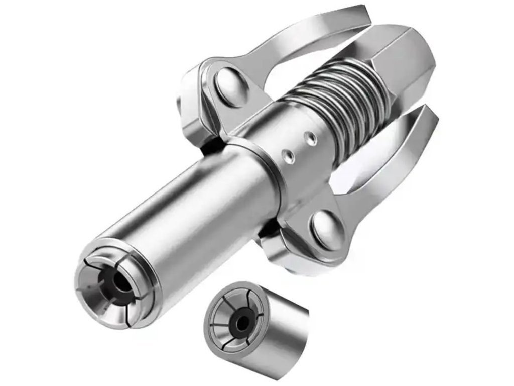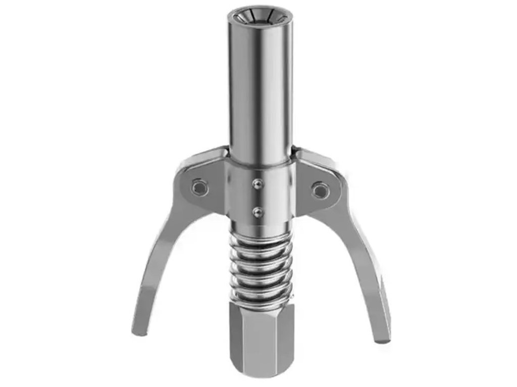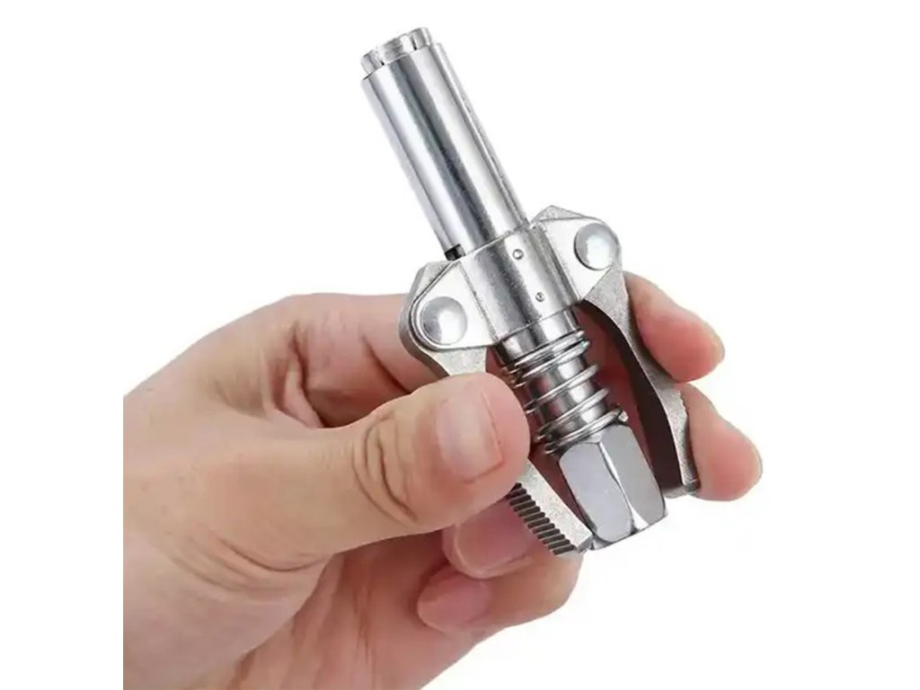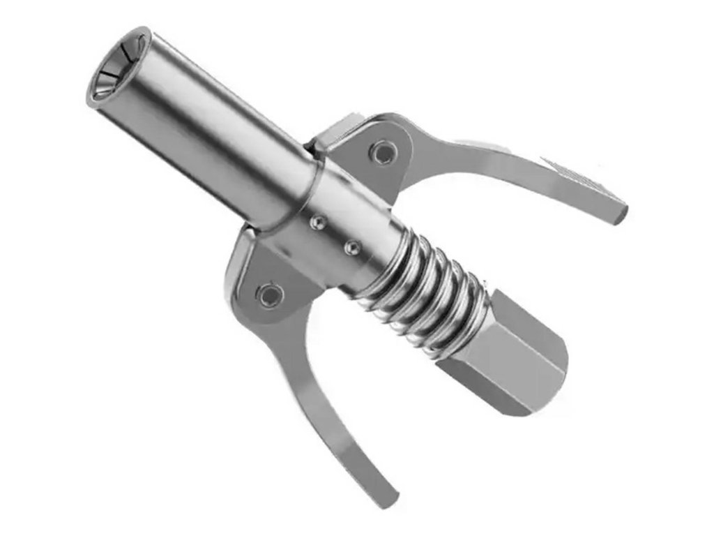 Samosvorná rychlospojka pro mazací lisy a třmeny. Vyrobeno z pevné, pozinkované oceli (nerez), která zajišťuje vysokou odolnost při používání a zabraňuje zatékání. Konstrukce vybavená šesti čelistmi a těsněním zabraňuje úniku během provozu. Dvojitá rukojeť umožňuje pohodlné ovládání jednou rukou. Hrot je extrémně univerzální - kompatibilní s různými typy maznic (manuální, pneumatické i elektrické) a s tryskami M6 / M8 / M10 / M12 / M14.