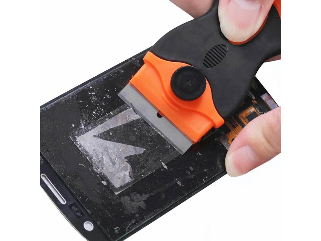 - Stalowe ostrze pozwala błyskawicznie usunąć uporczywe zabrudzenia z powierzchni płyty czy szkła.