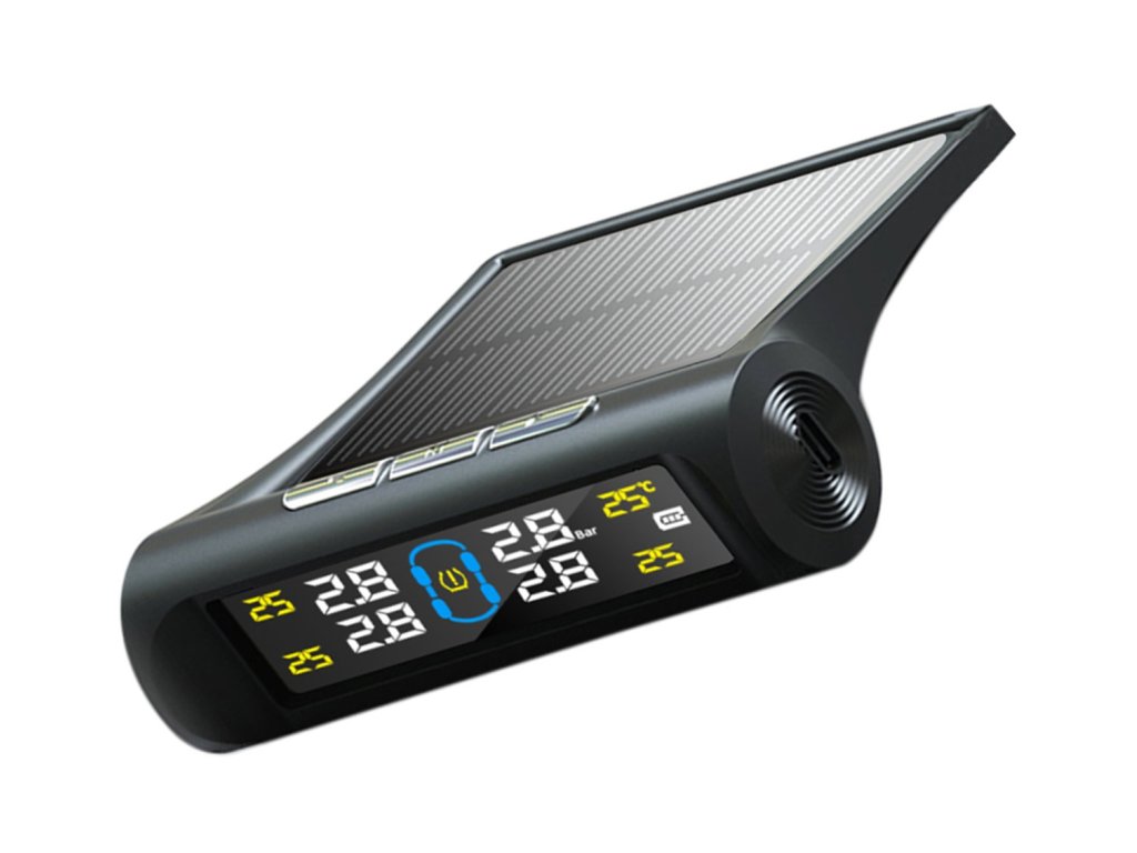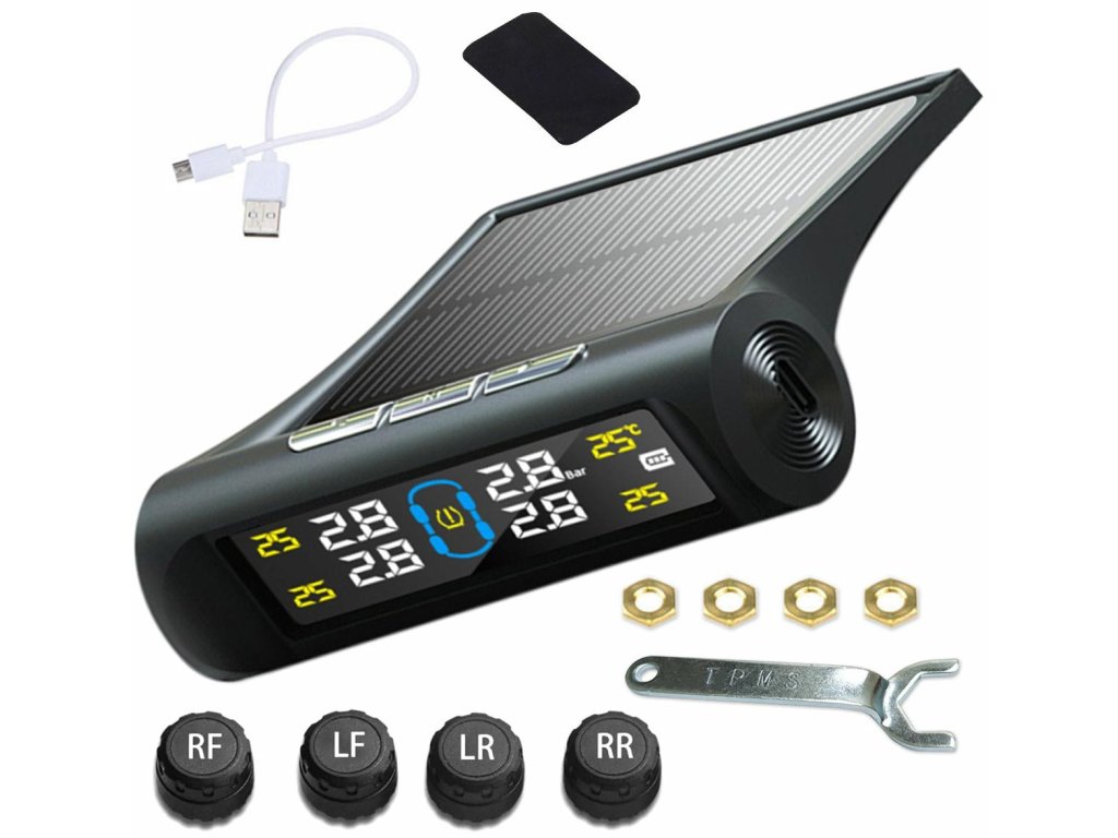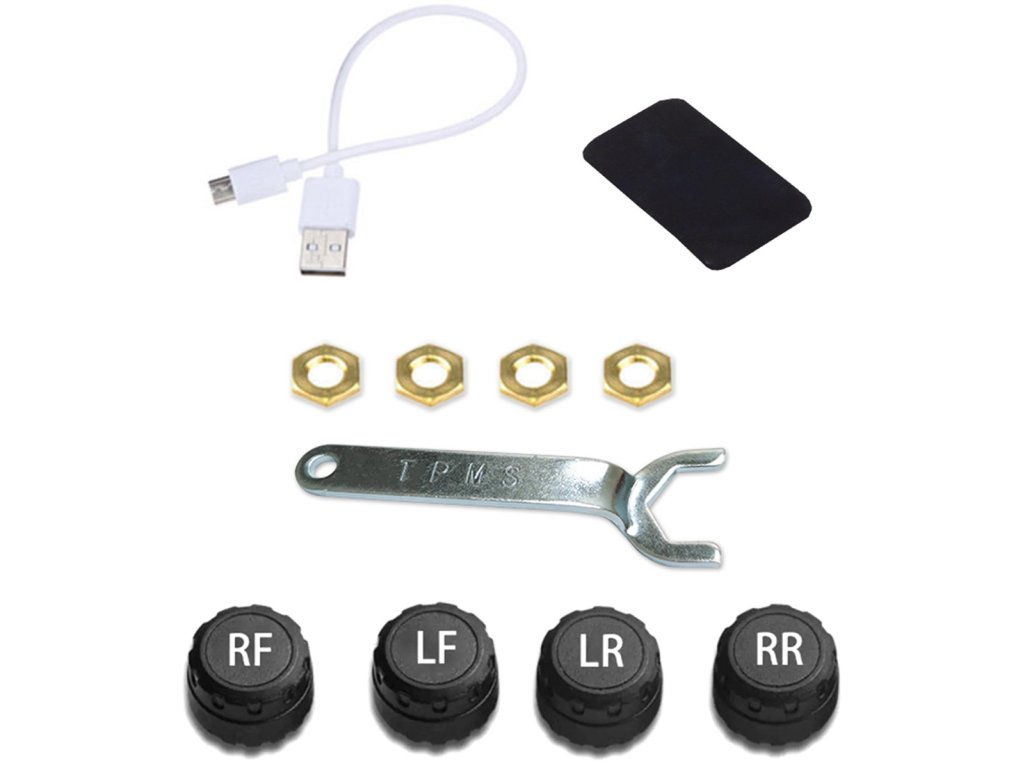 Kompletní sada senzorů tlaku a teploty v pneumatikách TPMS. Umožňuje průběžné sledování naměřených hodnot v konkrétní pneumatice. Snadná instalace a napájení senzoru ze solárního panelu. Sada senzorů odesílá informace do ovládacího panelu do 3 sekund od náhlé změny tlaku nebo teploty (nebo do 3 minut při postupných výkyvech). Přehledný LCD displej umožňuje snadné prohlížení naměřených hodnot. V případě nedostatečného osvětlení lze senzor napájet pomocí micro-USB kabelu.