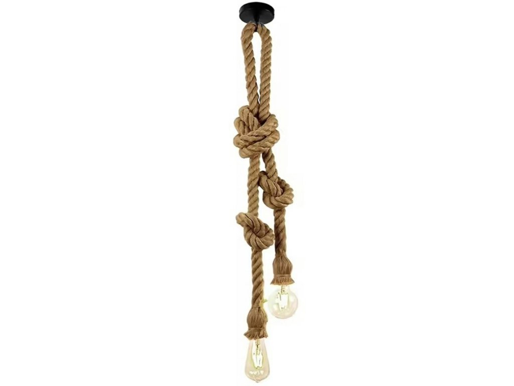Nádherný dekorativní prvek - stylová stropní lampa ve tvaru dvou lan. Obě ramena lampy jsou omotaná pravým jutovým provazem. Skvěle vypadá ve všech loftových pokojích nebo v interiérech v historickém stylu. Lampa je vyrobena z vysoce kvalitní oceli s práškovým nástřikem. Vybaveno dvěma standardními paticemi žárovek E27.