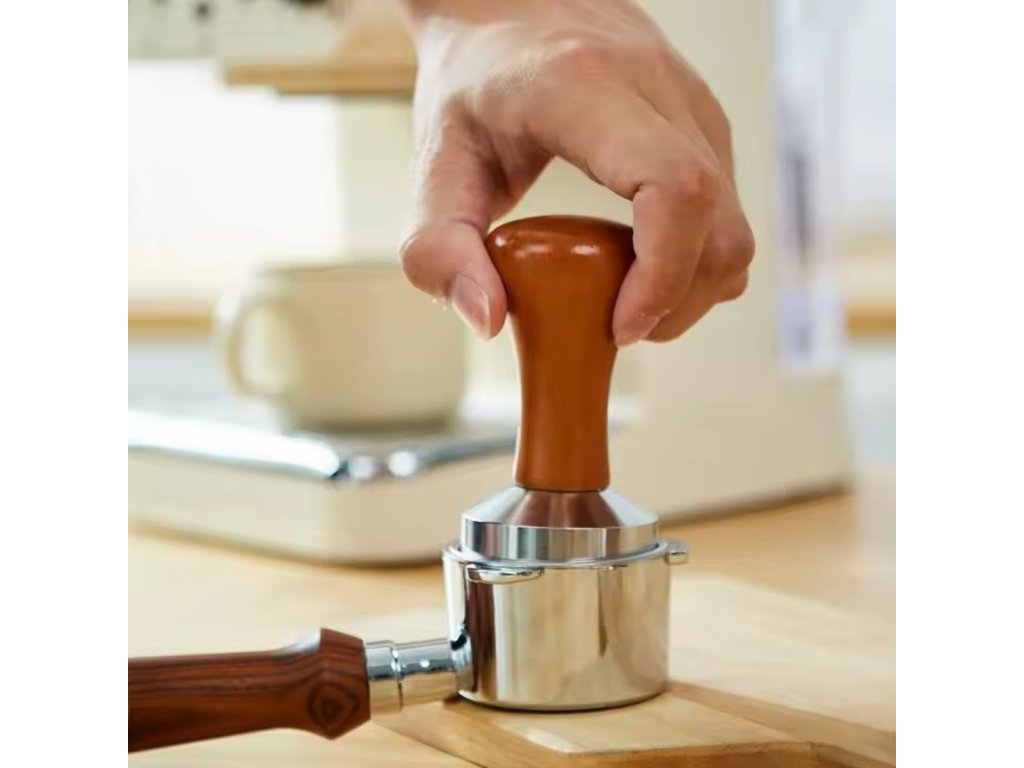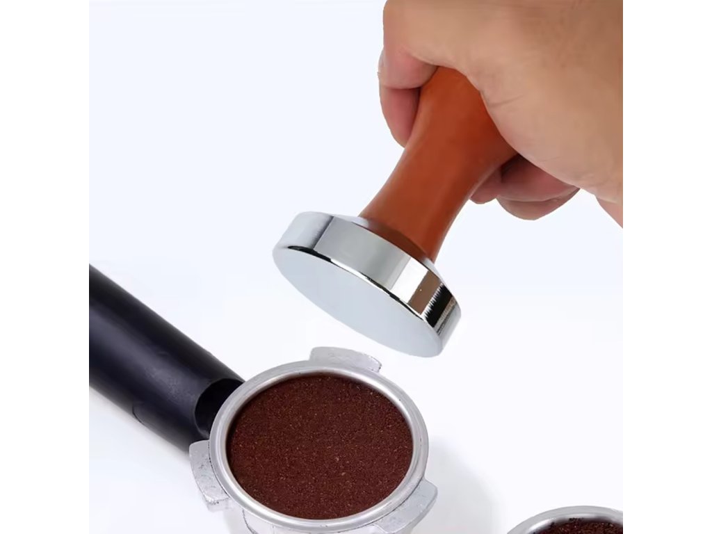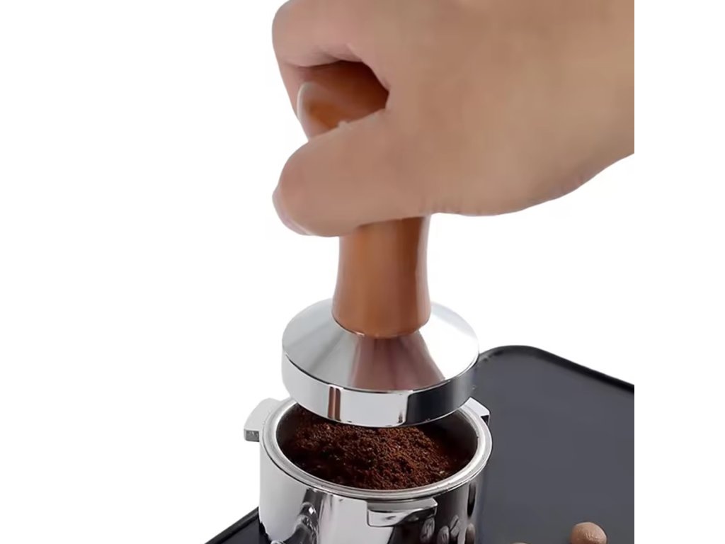- Materiał: drewno (rękojeść) + stal nierdzewna (tamper)
