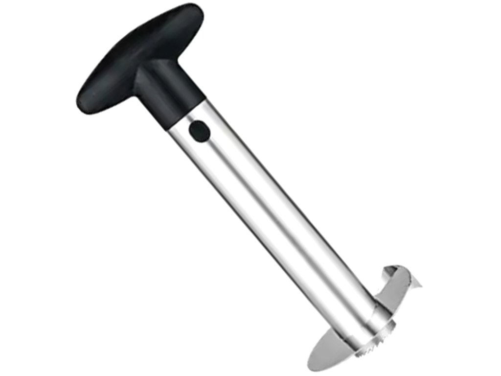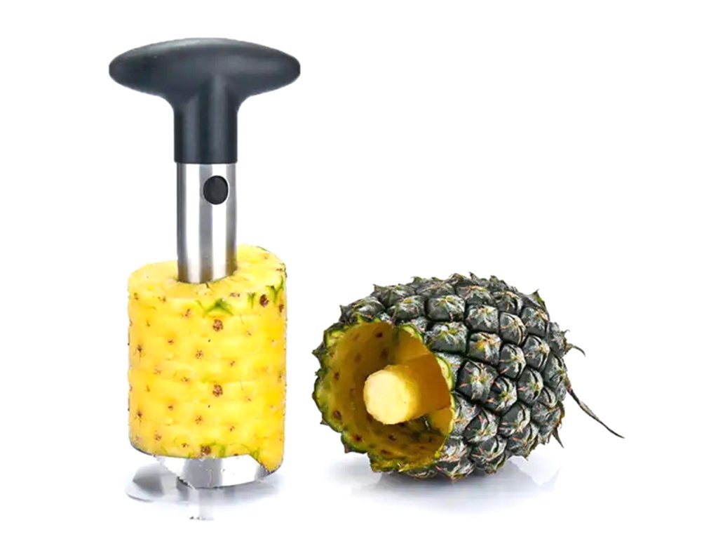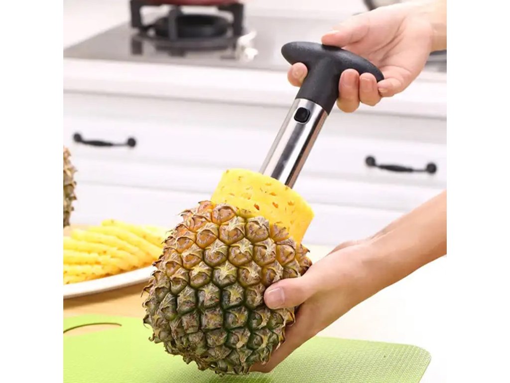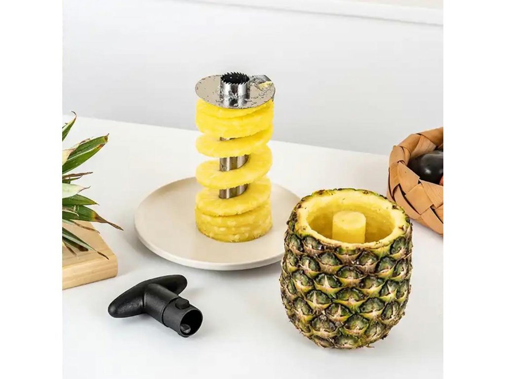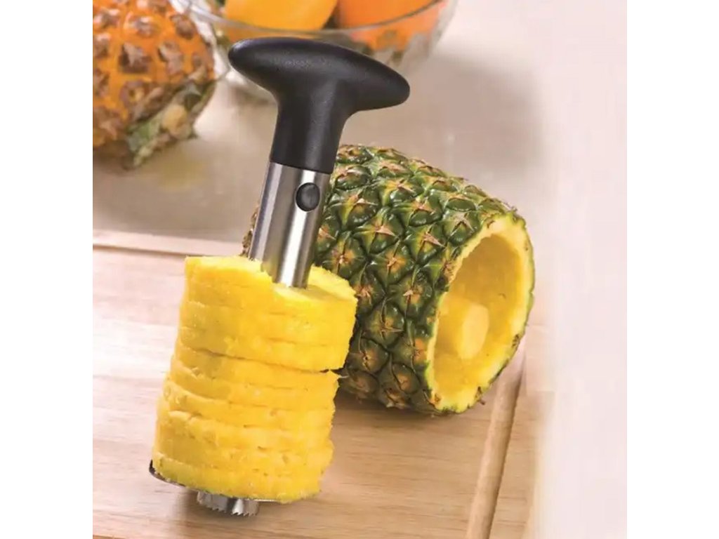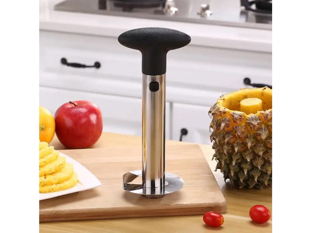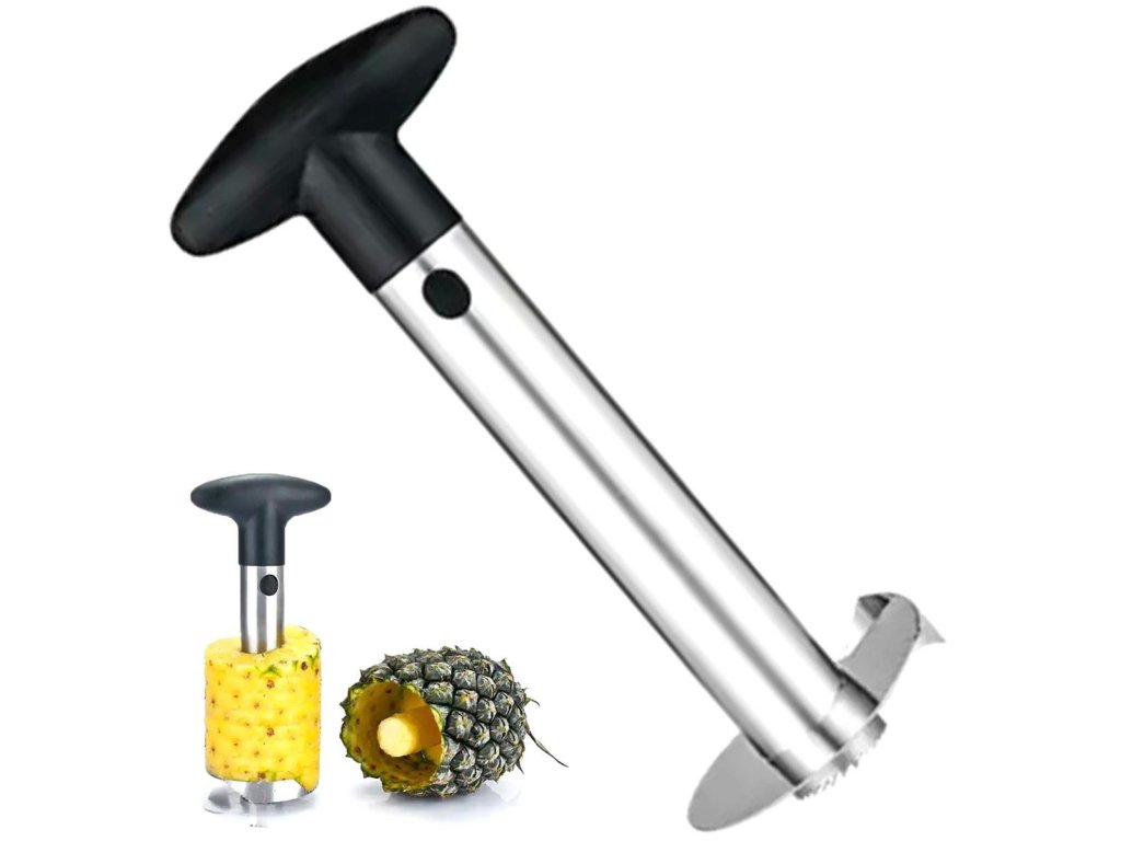 Ocelový džbán na ananas. Vybaveno pohodlnou rukojetí z tvrdého plastu. Kráječ slouží ke snadnému a rychlému vykrojení vnitřku, bez slupky a tvrdého středu. Spodní část je zakončena ostrými zuby, které se rychle zašroubují do ananasu.