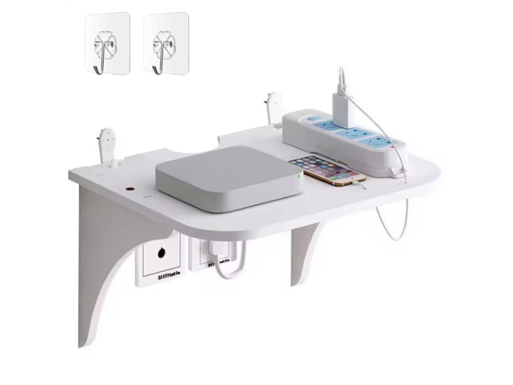 Kompaktní nástěnná police pro Wi-Fi router a další příslušenství. Velmi pohodlné řešení a velká úspora místa. Pevná instalace pomocí natloukacích kovových háčků. Vyhrazený otvor v desce stolu usnadňuje připojení síťových kabelů. Možnost alternativní instalace pomocí dvou samolepicích háčků!