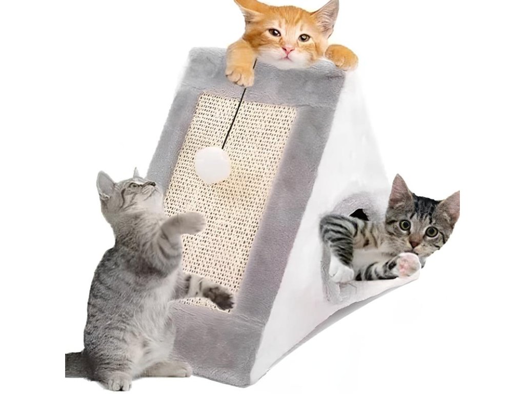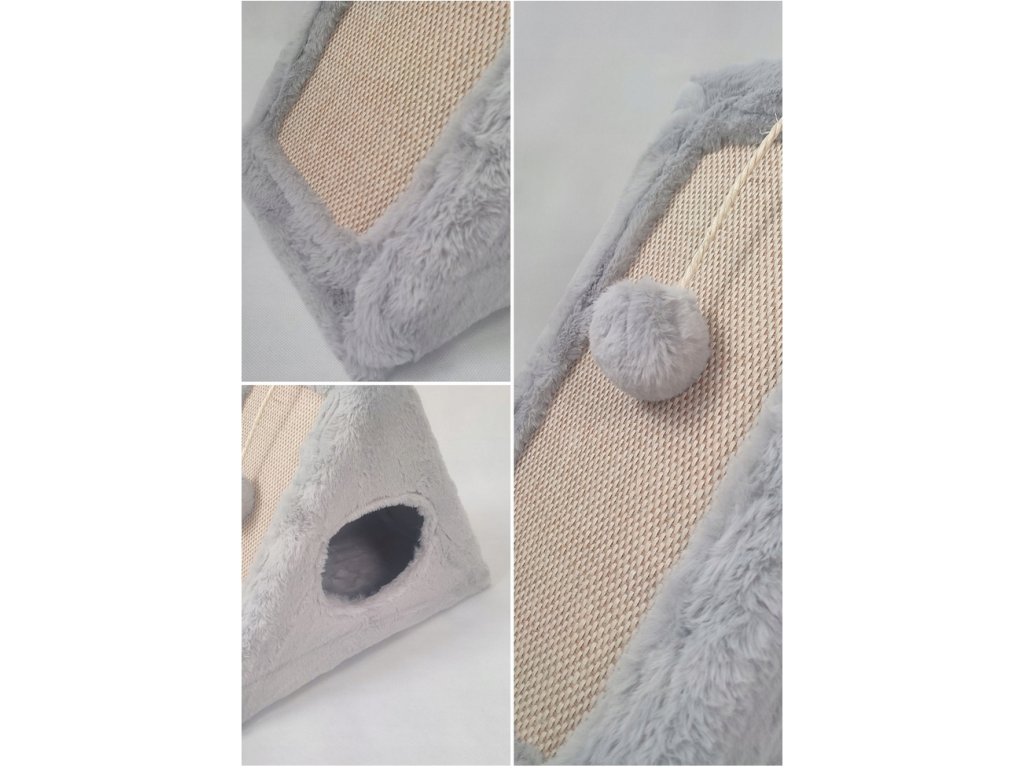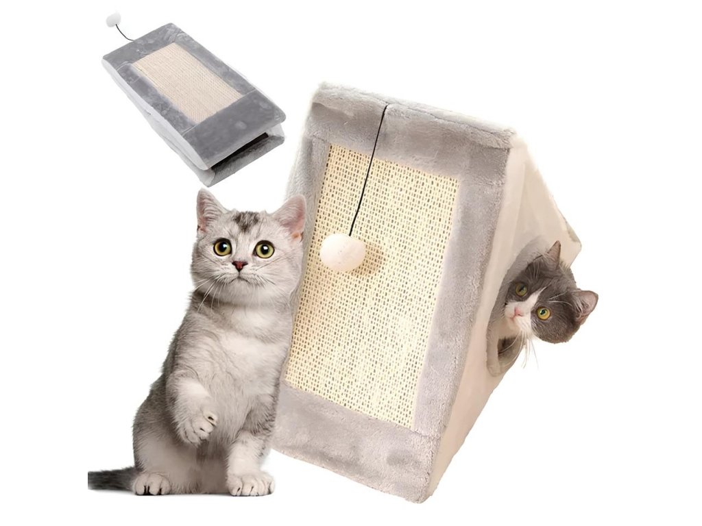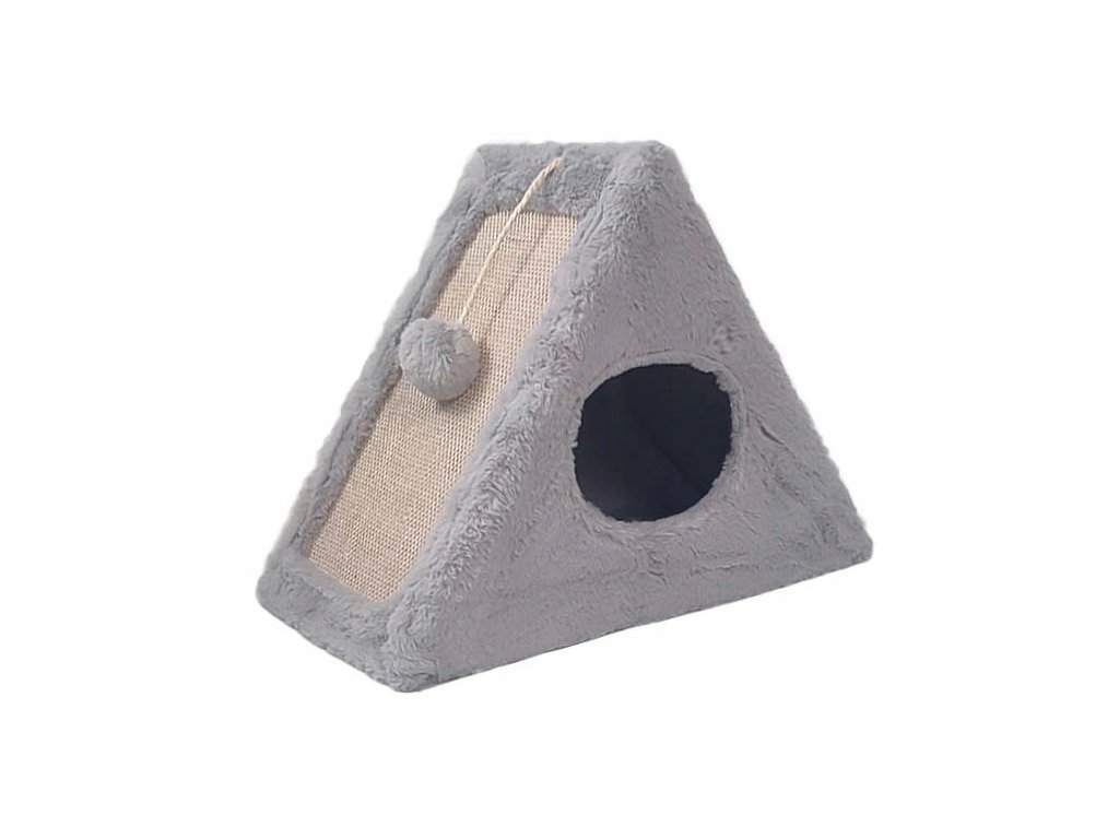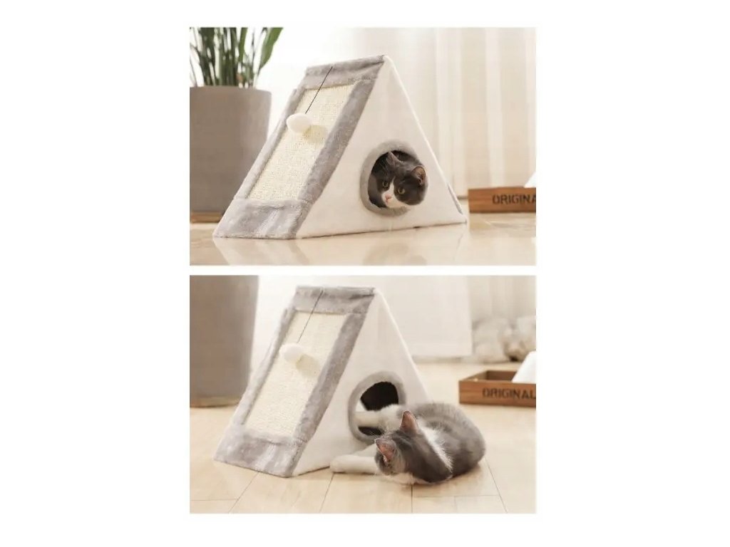 Kočičí domeček, škrabadlo, pelíšek, hračka, budkaKočičí domeček čalouněný měkkou látkou s vestavěným škrabadlem v sobě spojuje několik funkcí.