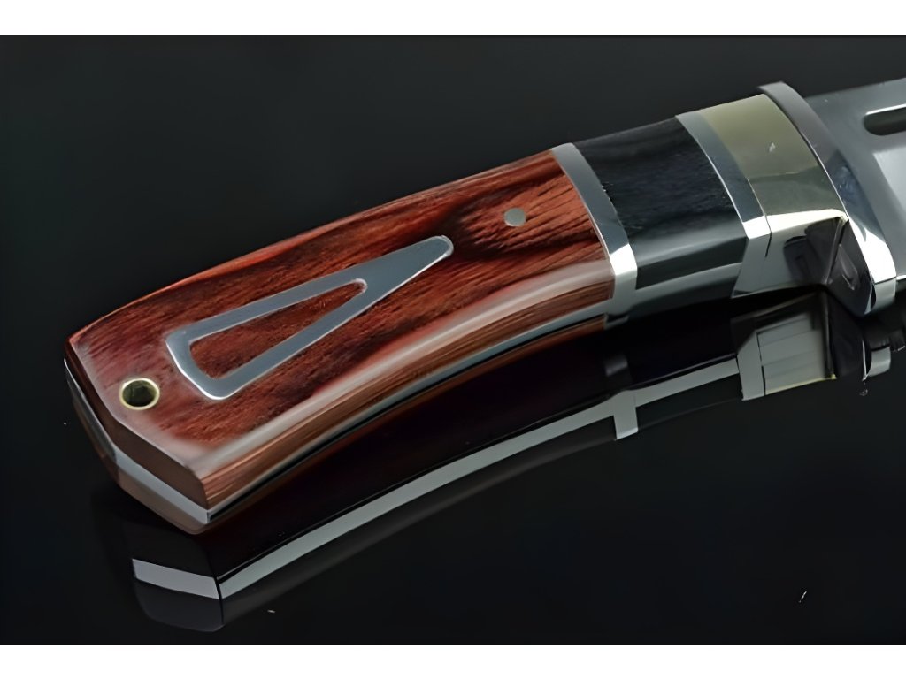 Ergonomická ocelová rukojeť s dřevěnou podšívkou a dekoracemi.