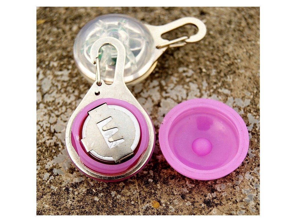 Světlo je vybaveno kovovou karabinou, takže jej lze k obojku připevnit jediným pohybem.