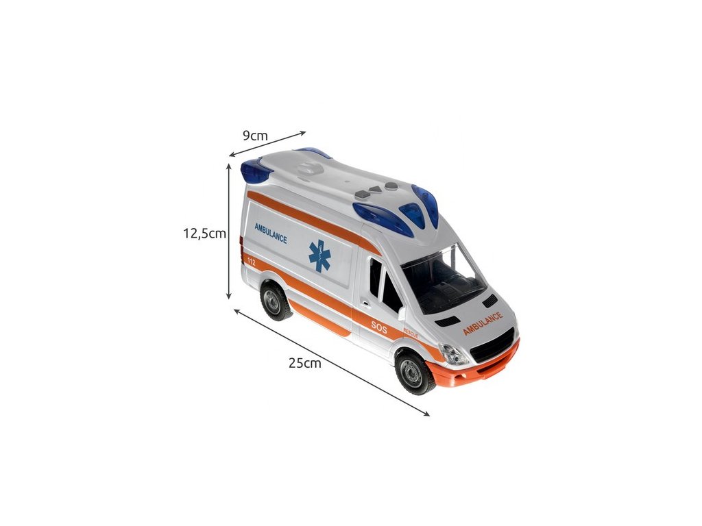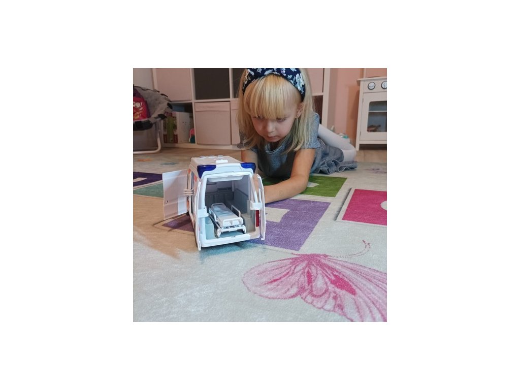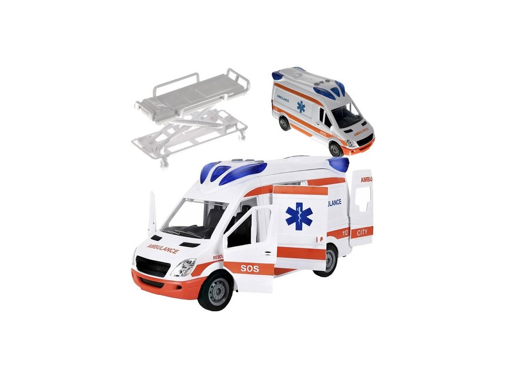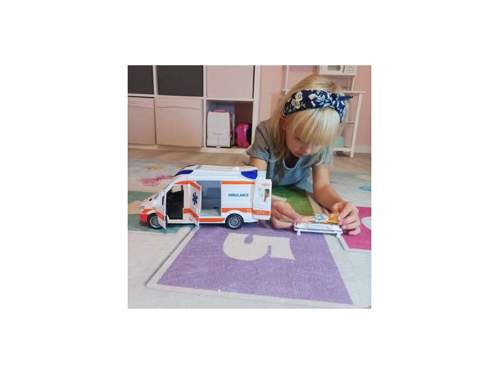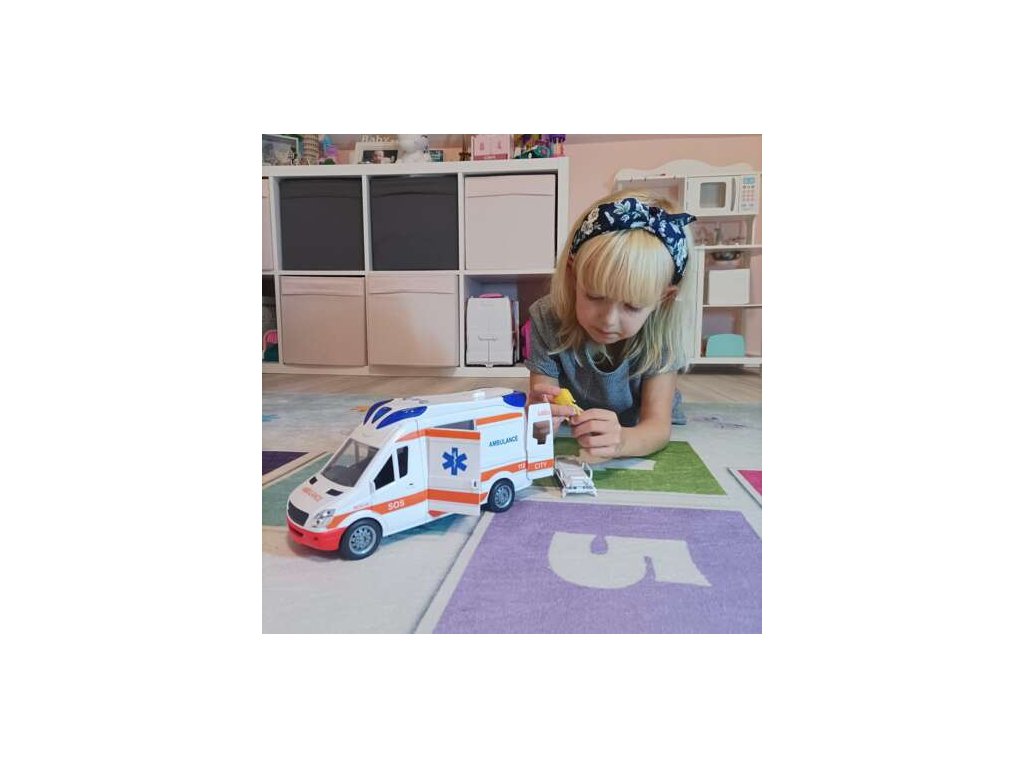 - OTEVÍRACÍ DVEŘE – hračka má otevírací dvířka. Otevírají se dveře řidiče, spolujezdce, boční a zadní dveře sanitky stačí zatáhnout.