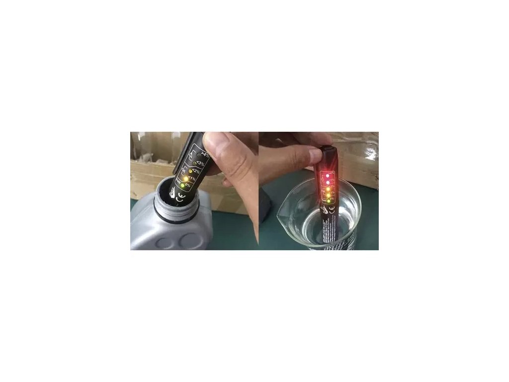 - 5 LED – tester má LED diody, které indikují hladinu vody v kapalině . Zelená dioda - baterie v pořádku, obsah vody < 1%, žlutá dioda - obsah vody od 1% do 2%, dvě žluté diody - obsah vody od 2% do 3%, červená dioda - obsah vody cca 3%, dvě červené diody - obsah vody nad 3 %.