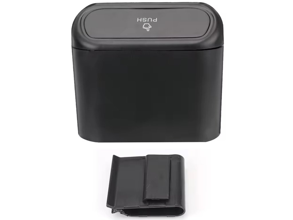 Uzamykatelný odpadkový koš do auta. Mimořádně praktický doplněk, který vám usnadní udržování pořádku v autě. Perfektní pro vyhazování drobného odpadu, který by mohl znečistit interiér vozidla. Nádoba je vzduchotěsná a neteče ze dna. Víko má pohodlný systém otevírání – stačí stisknout prstem. Velmi snadná instalace pomocí háčku na zadní straně koše.