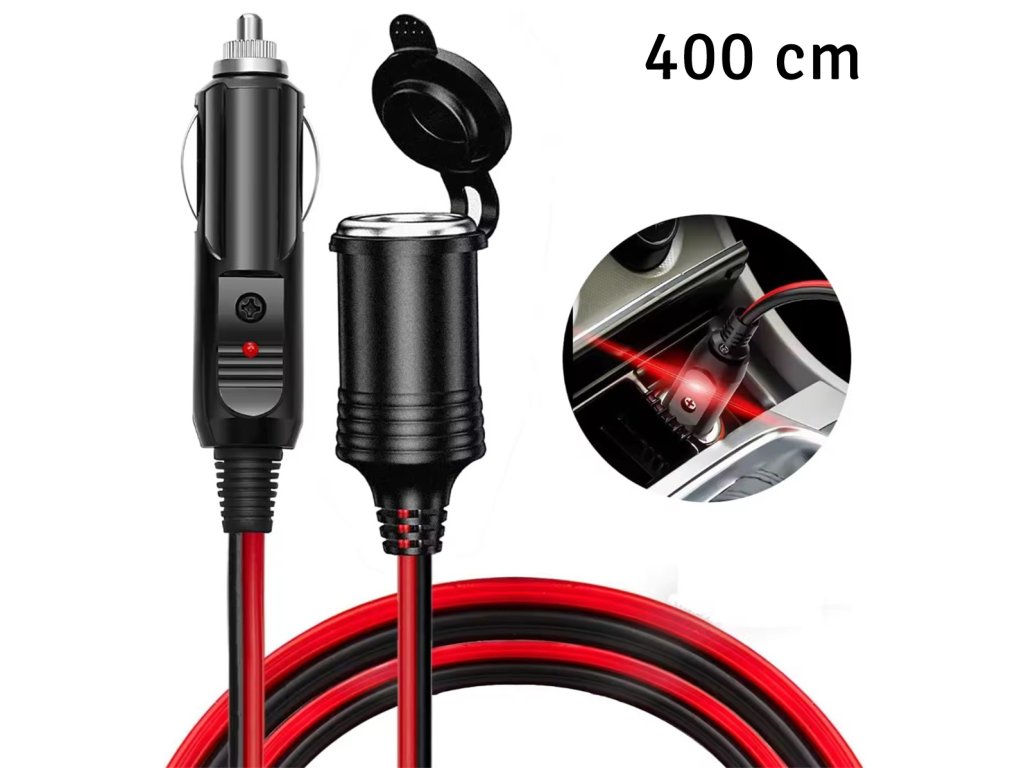 12V prodlužovací kabel do autozapalovače o délce 400 cm. Mimořádně praktická vychytávka, která umožňuje připojit zařízení napájená z 12V zásuvky umístěné daleko od vozidla. Ideální pro použití ve všech vozidlech, která mají 12V autozapalovač. Umožňuje používat zařízení s maximálním proudem až 15A. Dodatečný kryt zásuvky jej chrání před náhodným postříkáním nebo znečištěním.