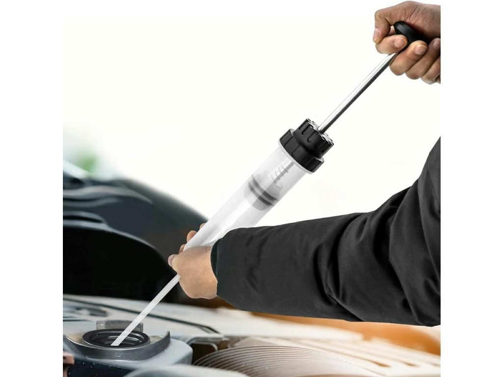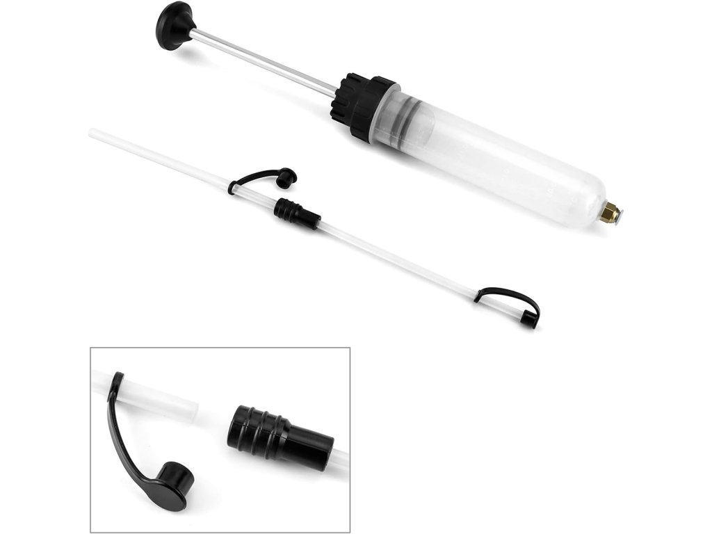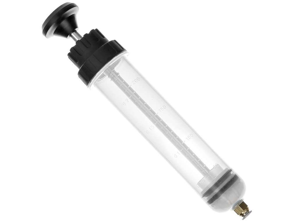 Stříkačka s pístem na olej a kapaliny. Vysavač je ideální pro automobilové aplikace. Usnadňuje odstranění přebytečného oleje a přesné měření množství brzdové kapaliny nebo maziv. Vyrobeno z pevného materiálu odolného vůči chemikáliím. Vybaveno velkým pístem a odvzdušňovacím systémem, což ještě více usnadňuje práci. Nádoba na 200 ml má přesnou odměrku dělenou každých 50 ml. Sada obsahuje sadu hadic a zástrček.