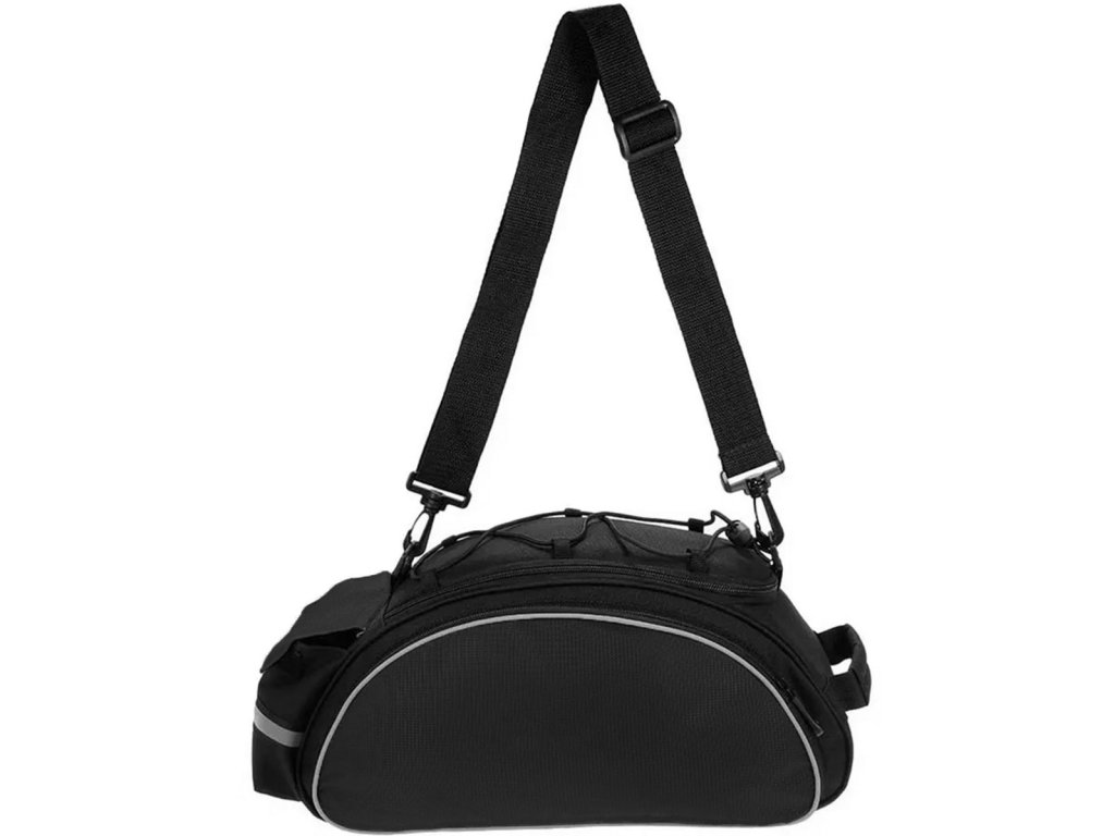 Prostorný 4komorový vak na nosič kol vyrobený z odolného a snadno čistitelného, voděodolného polyesteru. Mimořádně užitečné při delších i kratších cyklistických výletech. Taška je vybavena prostornou hlavní přihrádkou o objemu 15 litrů a 3 dalšími kapsami na zip (dvě boční kapsy na zip a zadní kapsa na suchý zip). Přídavný držák na lahve usnadňuje přenášení nápojů s sebou. Taška má také reflexní prvky, které zvyšují naši bezpečnost a činí nás viditelnými po setmění. Brašna se připevňuje k nosiči kol (vzadu) pomocí suchých zipů. Díky přiloženému popruhu a rukojeti jej lze použít i jako příruční zavazadlo – takže si sami rozhodnete, k čemu ho chcete používat.