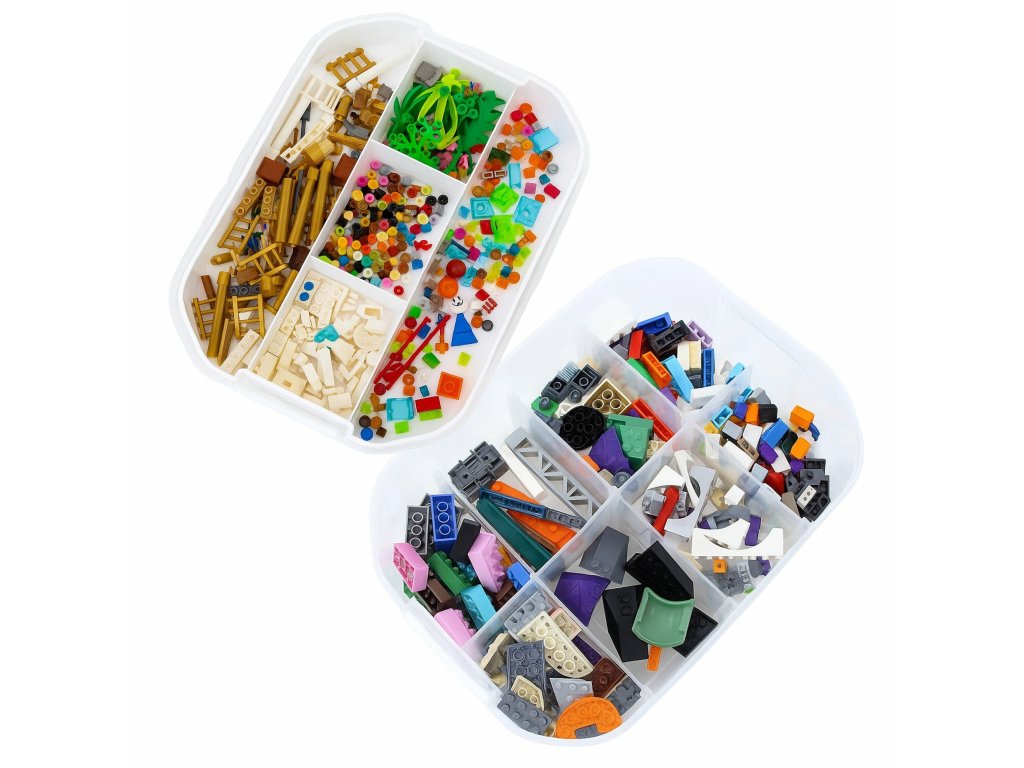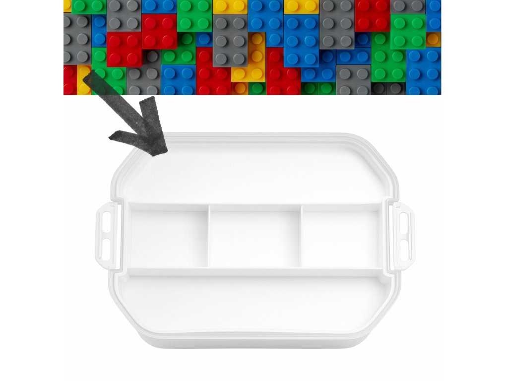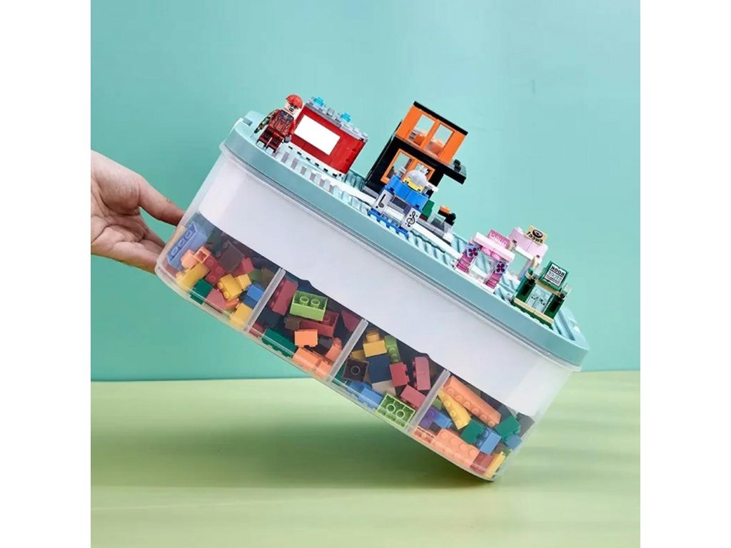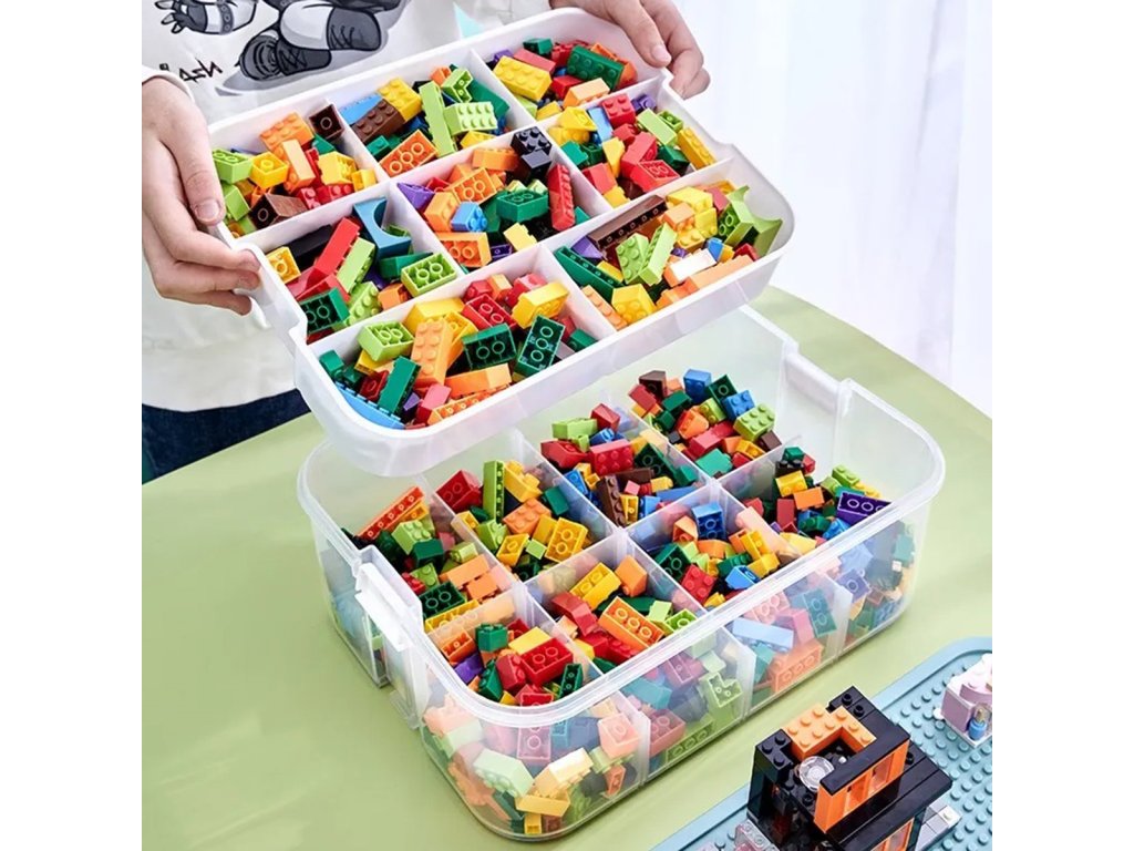 Skládací organizér na stavebnice a hračky. Je vybaven dvěma odnímatelnými úrovněmi se zapínáním na klip a horní víko má praktické madlo pro přenášení. Každá úroveň má samostatné přihrádky. Tento produkt povzbuzuje děti k úklidu a usnadňuje udržování pořádku.
