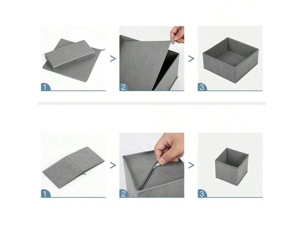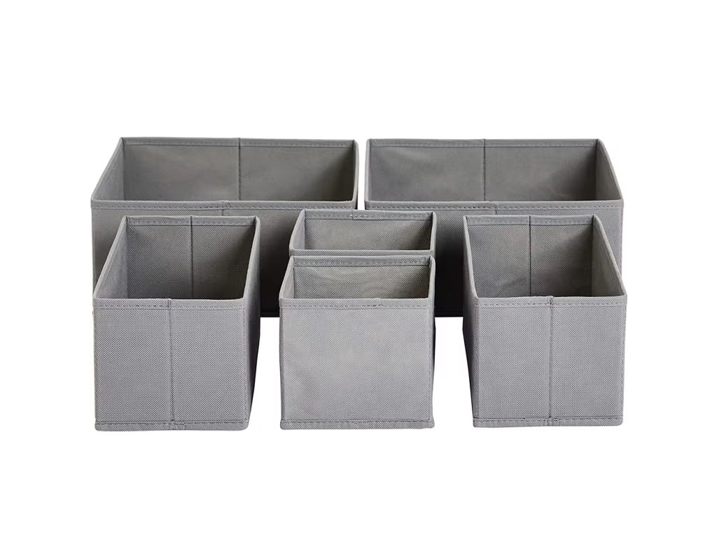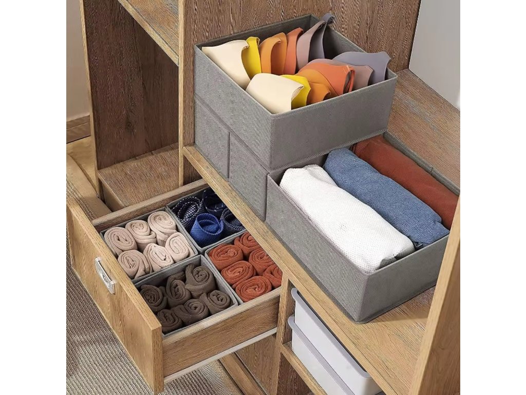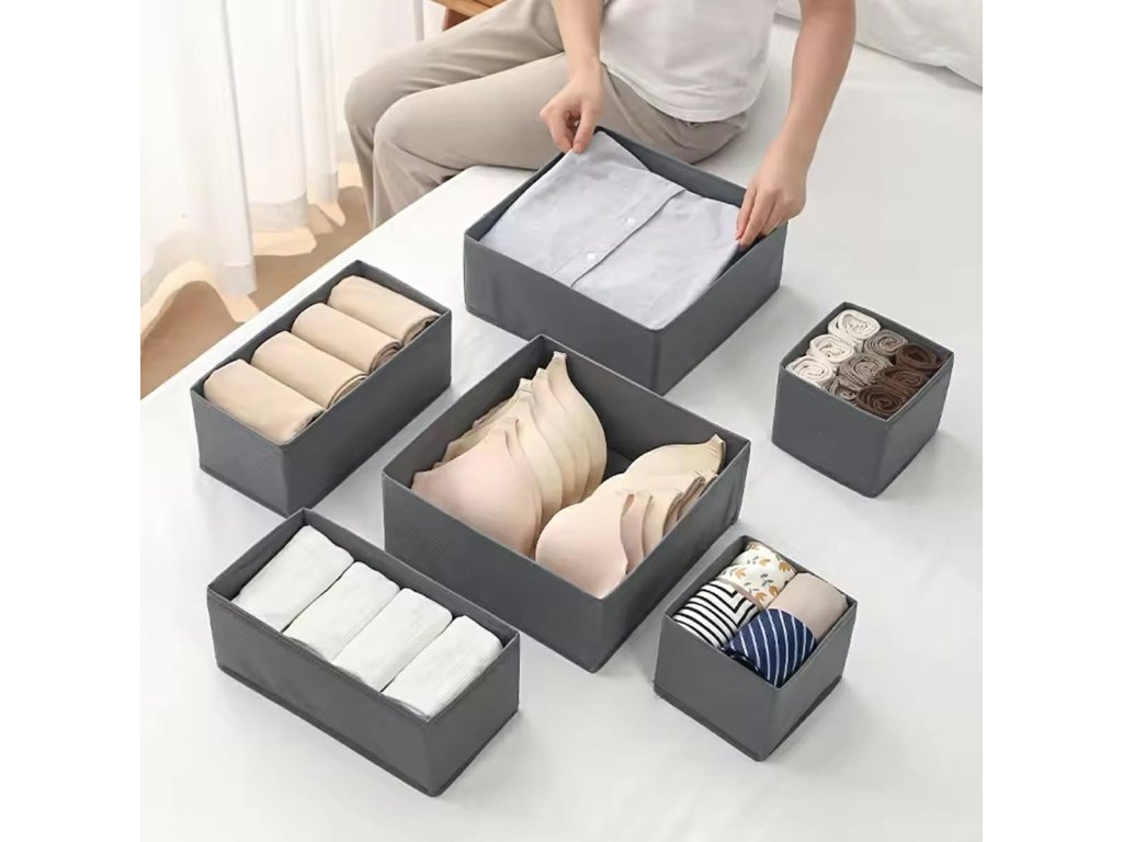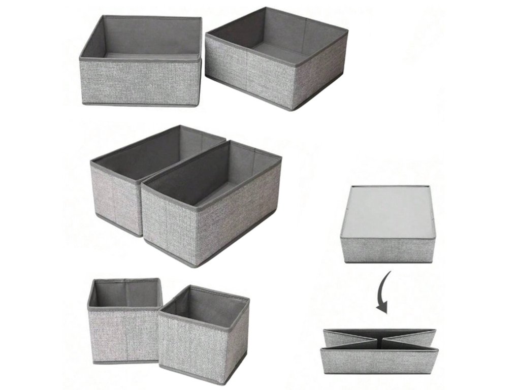 Sada 6 zásuvkových organizérů. Vložky poskytují jednoduchý, praktický a levný způsob, jak uspořádat svou sbírku kravat, ponožek, opasků a spodního prádla. Sada obsahuje tři organizéry různých velikostí, počtu přihrádek a použití. Jsou vyrobeny z pevného, prodyšného materiálu. Otevřený design umožňuje rychlý přístup k oblečení. Skládací funkce umožňuje další úsporu místa, když jednu z vložek nepoužíváte.