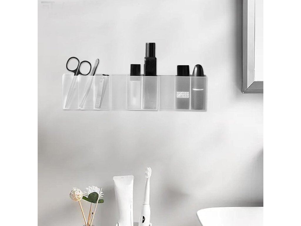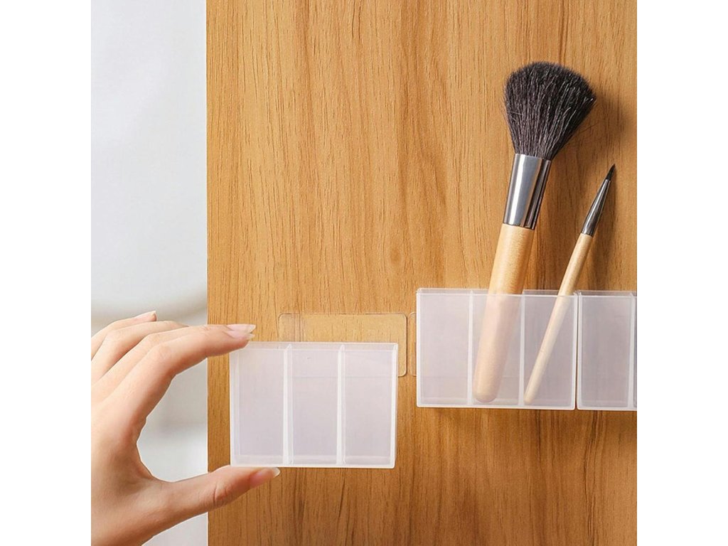 Samolepící koupelnový organizér na drobnosti se třemi přihrádkami. Perfektní řešení pro uložení drobné kosmetiky nebo např. Struktura je vyrobena z průhledného materiálu, což usnadňuje přehled o obsahu. Neinvazivní instalace na stěnu pomocí samolepicí pásky na zadní straně.