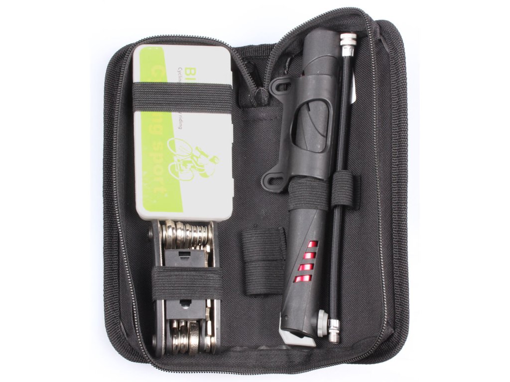 Multifunkční sada cyklistického nářadí Merco Tool Set je určená pro všechny cyklisty, kteří chtějí být na cestě maximálně připraveni a v případě nutnosti tak byli schopni své kolo rychle opravit. Tato profesionální sada nářadí obsahuje imbusové klíče 2 | 2,5 | 3 | 4 | 5 | 6 mm, šroubováky +|-, klíče 8, 10, 15 mm a 14GE, 3x montážní páku, sadu lepení pro rychlou opravu píchlé duše a malou ruční pumpičku s hadičkou. Pumpičku můžete na cestách díky přiloženým nástavcům a jehle používat i k nafukování sportovních míčů, lehátek apod. Celá sada Merco Tool Set je uložená v praktickém a voděodolném pouzdře, které lehce připnete k rámu kola pomocí dvou suchých pásků. Pouzdro s celou sadou má rozměry 22 x 10 x 6 cm a hmotnost necelých 530 g.Doplňkové parametry
