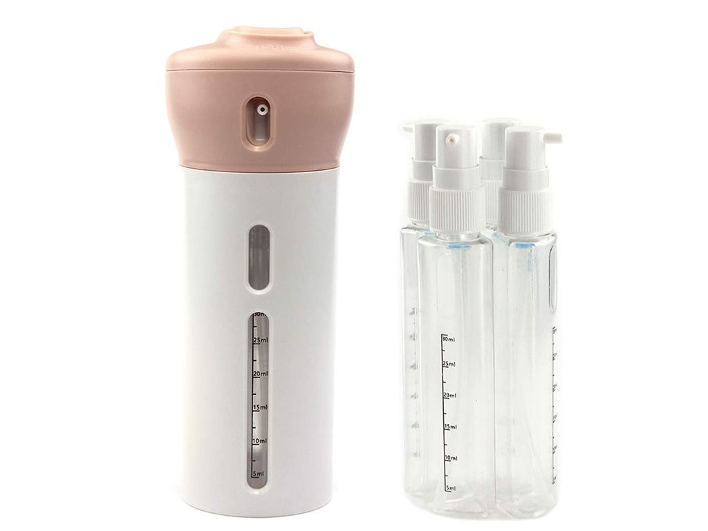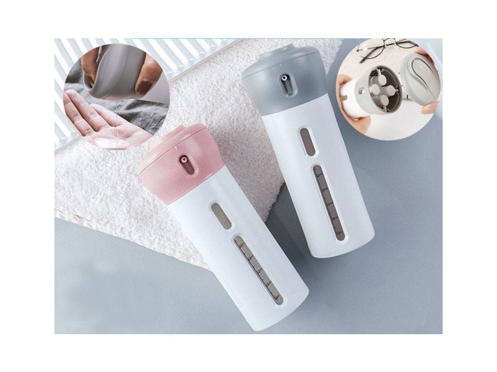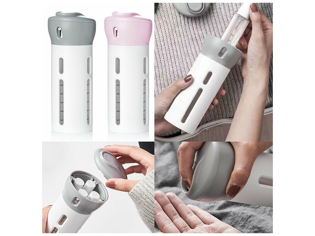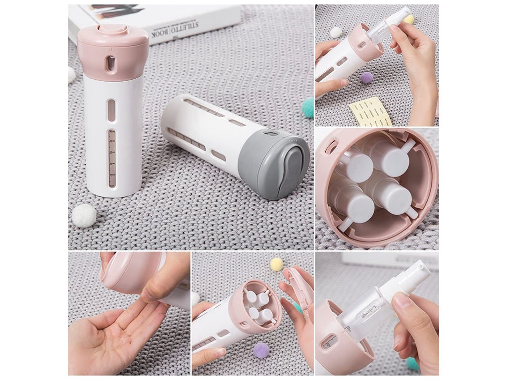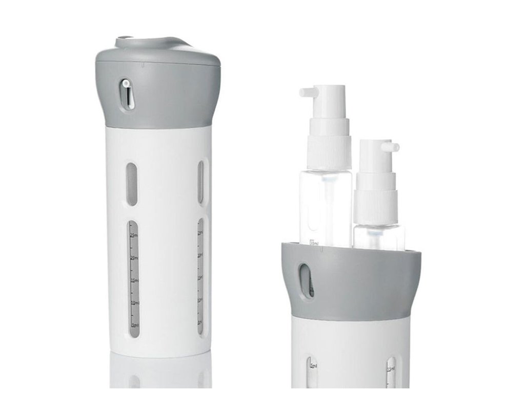 Praktický cestovní kontejner, který se osvědčí v každé situaci. Díky němu ušetříme spoustu místa v zavazadle. Umožňuje skladování nezbytných kosmetických přípravků v tekuté formě. V souhrnném pouzdře jsou čtyři průhledné plastové kontejnery s dávkovačem, každý o objemu 40 ml (měrka do 30 ml).