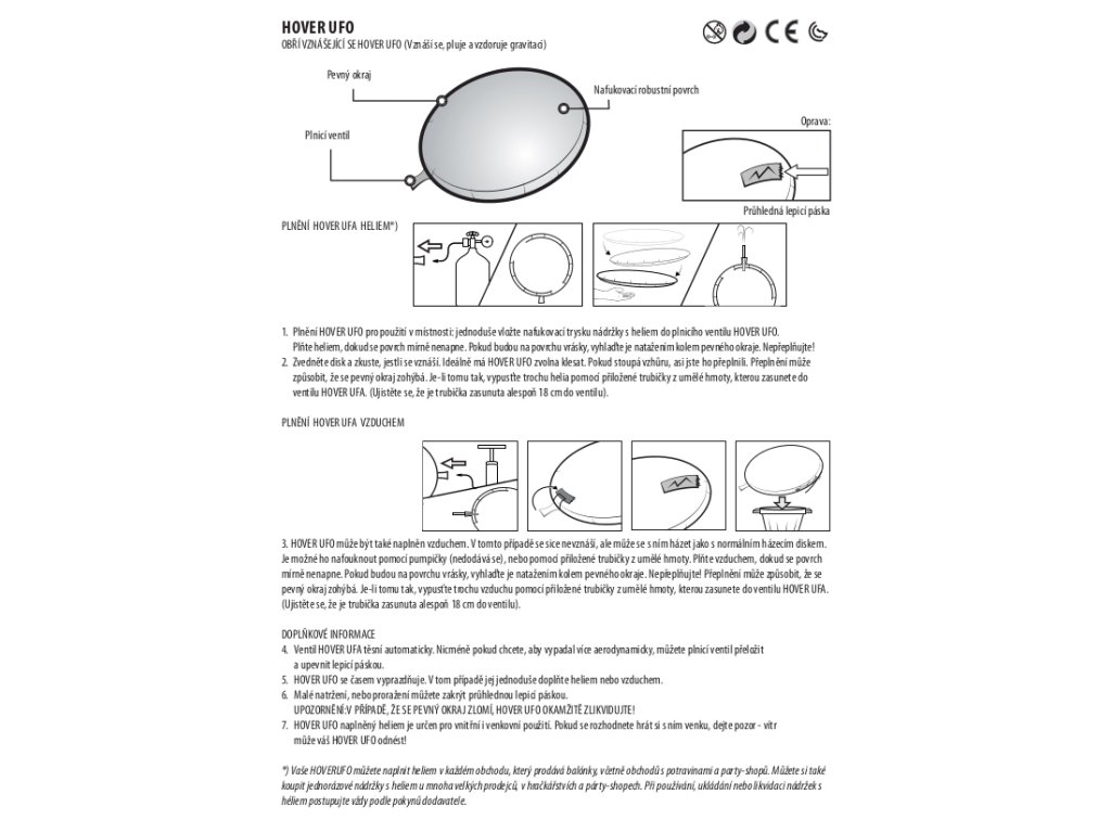 Nafukovací létající talíř. Stačí nafouknout vzduchem ( trubička pro nafukování součástí balení) nebo heliem, hodit a získáváte neuvěřitelné množství zábavy. Hover Ufo vyhodíte do vzduchu a necháte jej unášet větrem a se zábavou pozorujete neuvěřitelné kreace létajícího talíře.