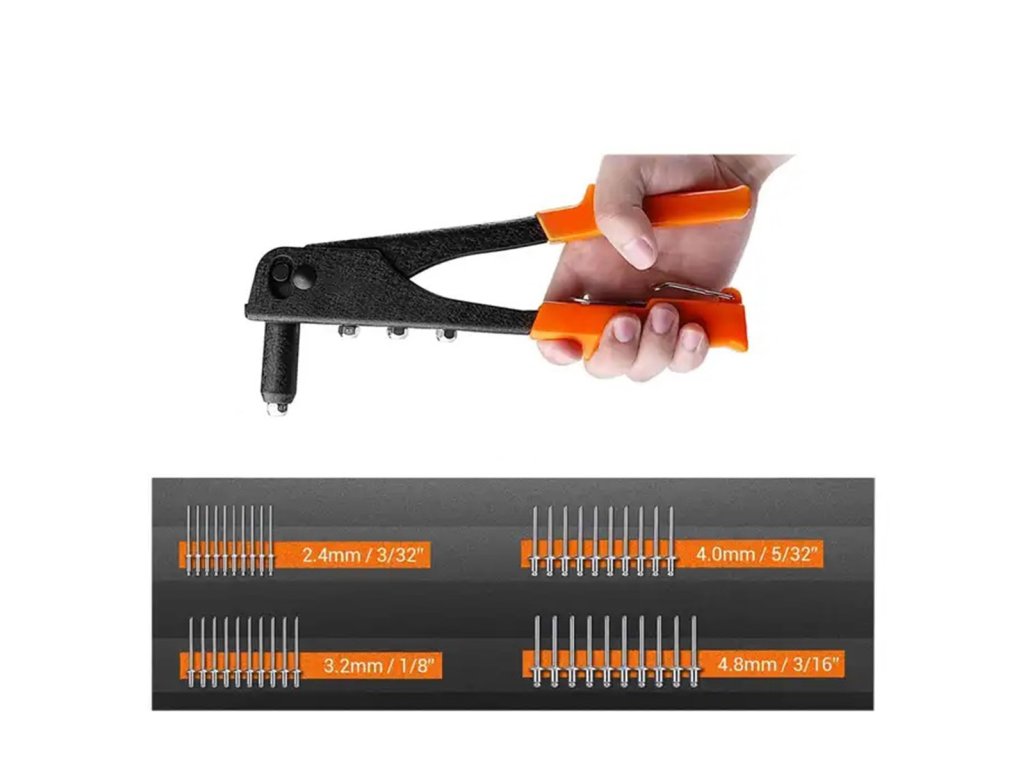 - Přijatelné velikosti nýtů (4 typy): 2,4 mm / 3,2 mm / 4,0 mm / 4,8 mm