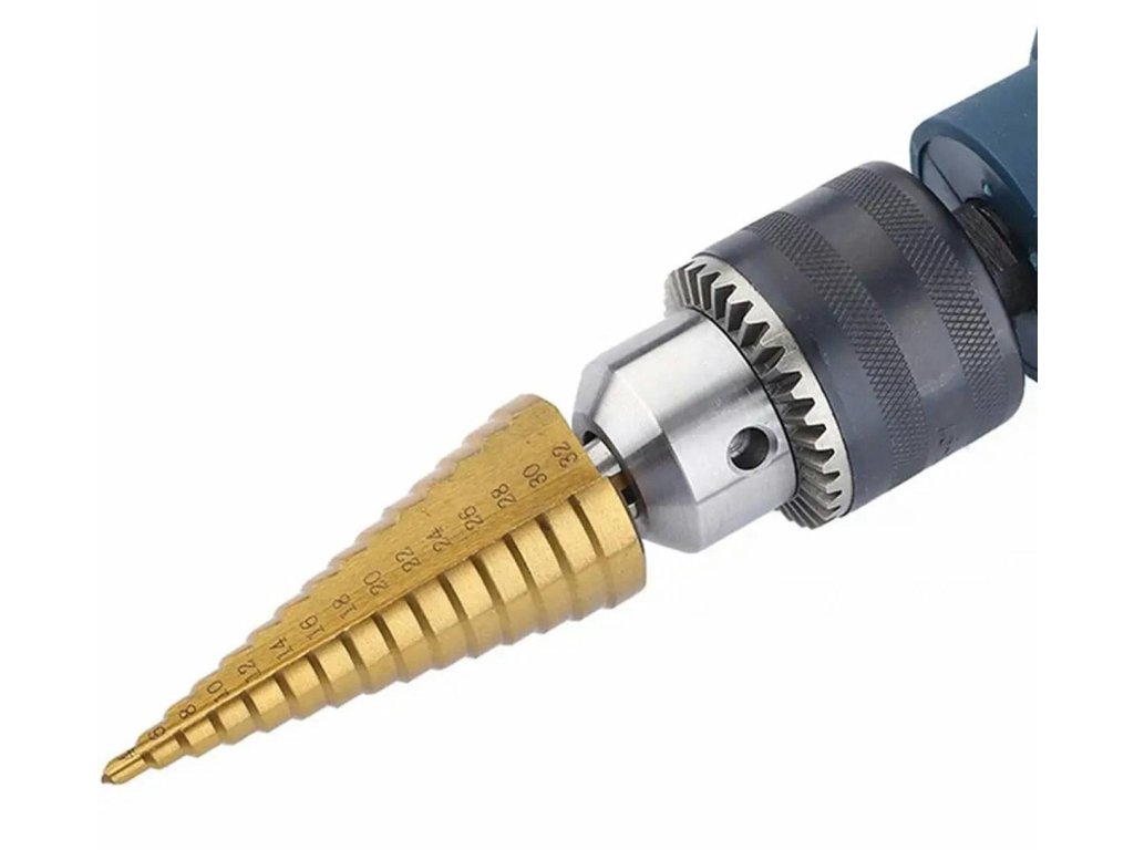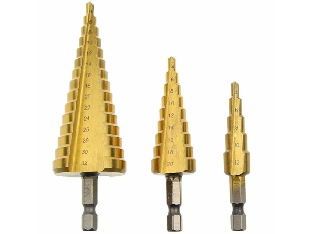 Sada 3 broušených vrtáků z rychlořezné oceli (HSS) se zpevňujícím titanovým povlakem. Jsou perfektní pro zpracování tenkých plechů, plastů a všech kovů bez železa ve slitině. Odstupňované každé 2 mm (průměr od 4 do 32 mm). Mají standardní HEX rukojeť a laserem řezané číslování.