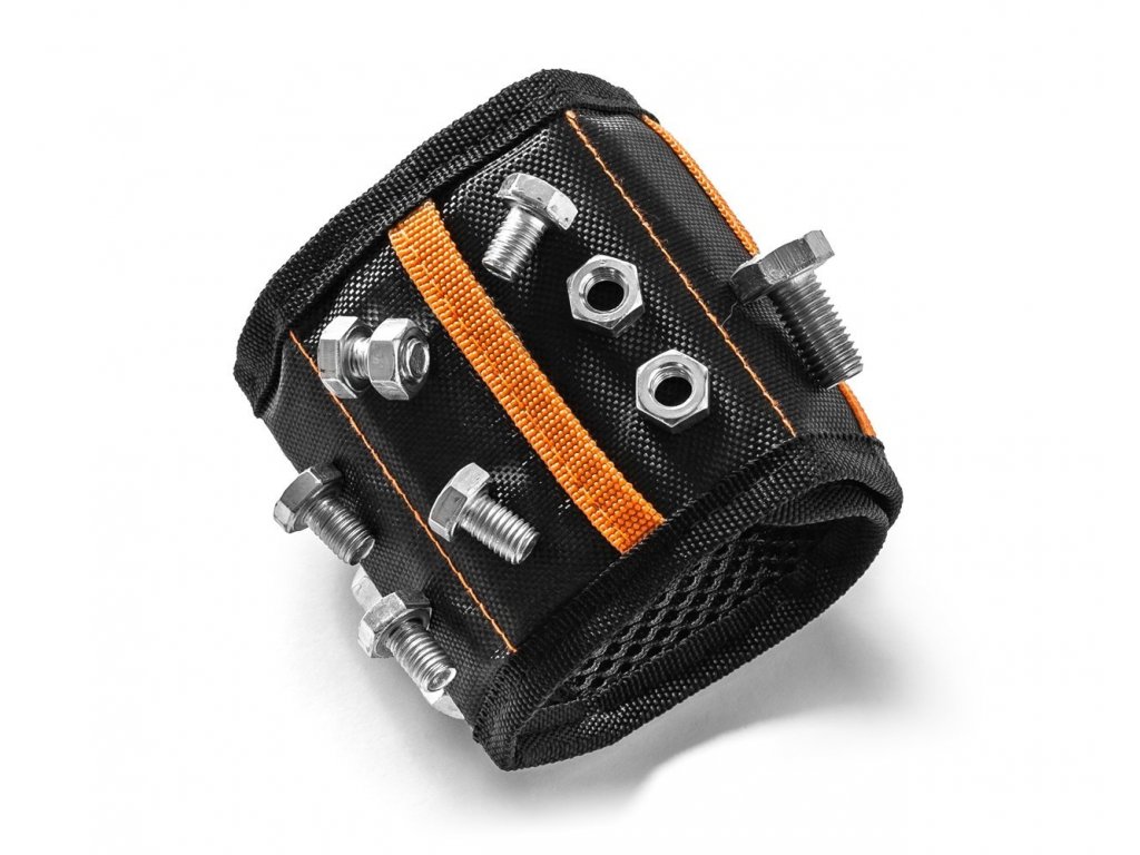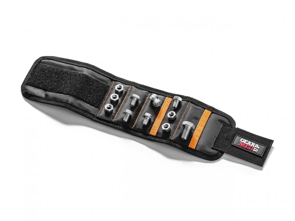 Patnáct silných magnetů a dvě kapsy pro nemagnetické držení věcí, které potřebujete při kutilských činnostech (šrouby, hřebíky, vrtáky, bity atd.)