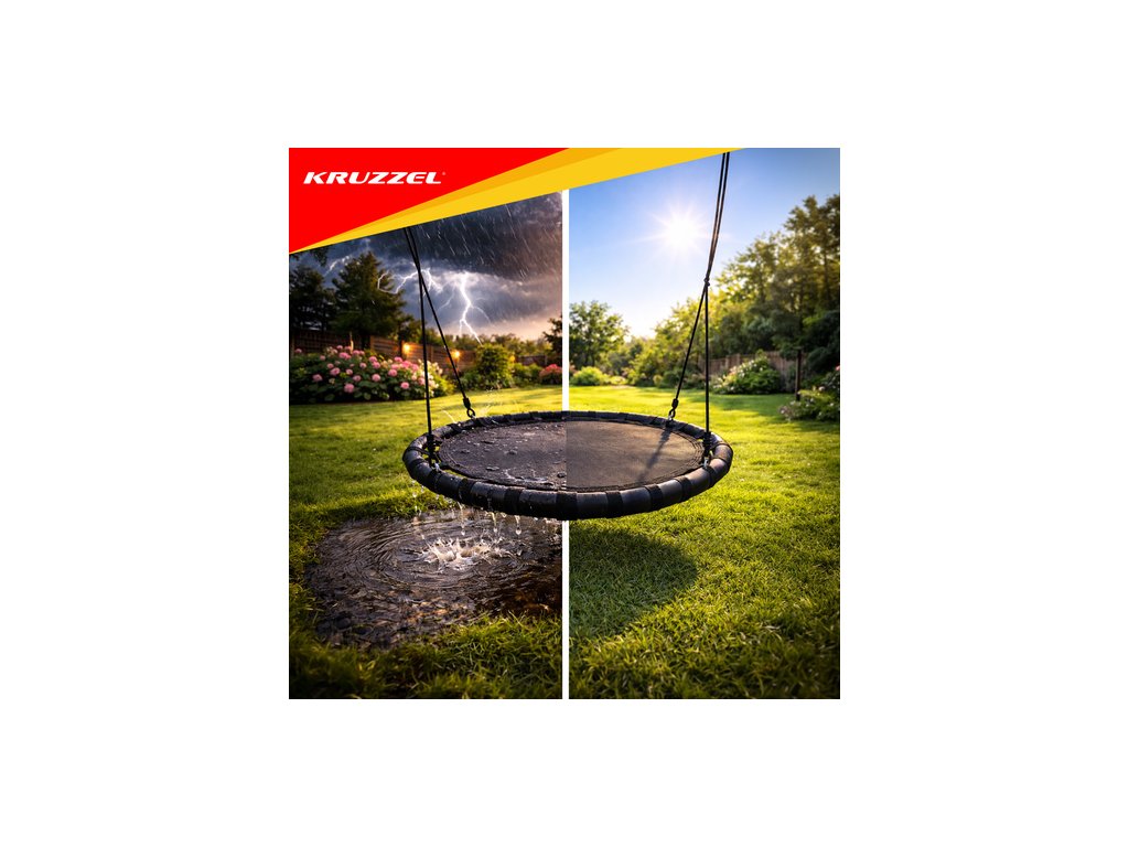 ? ODOLNÉ VŮČI POvětrnostním vlivům - houpačka je vyrobena z materiálů, které jsou odolné vůči povětrnostním vlivům a rychle schnou. Díky tomu ji lze bezpečně ponechat venku i za nepříznivých povětrnostních podmínek. To vám dává jistotu, že i když prší nebo fouká velmi silný vítr, nemusíte houpačku hned sundávat a dávat do domu nebo garáže/suterénu.