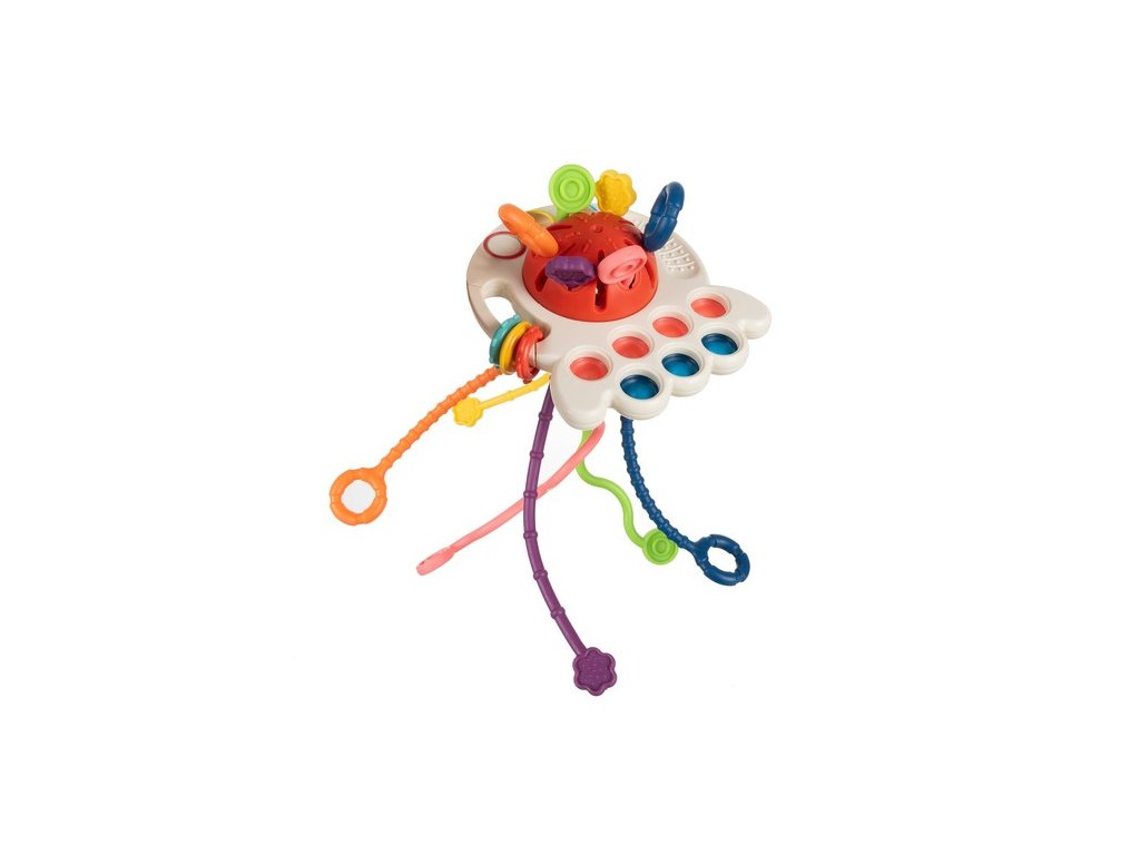 - 6v1 - kousátko je vybaveno šesti texturovanými strunami, které vydávají zvuky různé zvuky a vibrace jak je protahujete otvory. Struny mají různé konce, což pomáhá při nácviku úchopu a rozvoji jemné motoriky. Kousátko má měkké, kulaté knoflíky smyslové ve dvou řadách, které lze odsunout na druhou stranu. Tato funkce rozvíjí manuální dovednosti a koordinaci ruka-oko. Tři plastové kroužky s různými texturami poskytnout dítěti další hmatové podněty, které stimulují jeho hmat. Teether má povrch s výraznou kuličkovou texturou , která navíc stimuluje hmat dítěte.