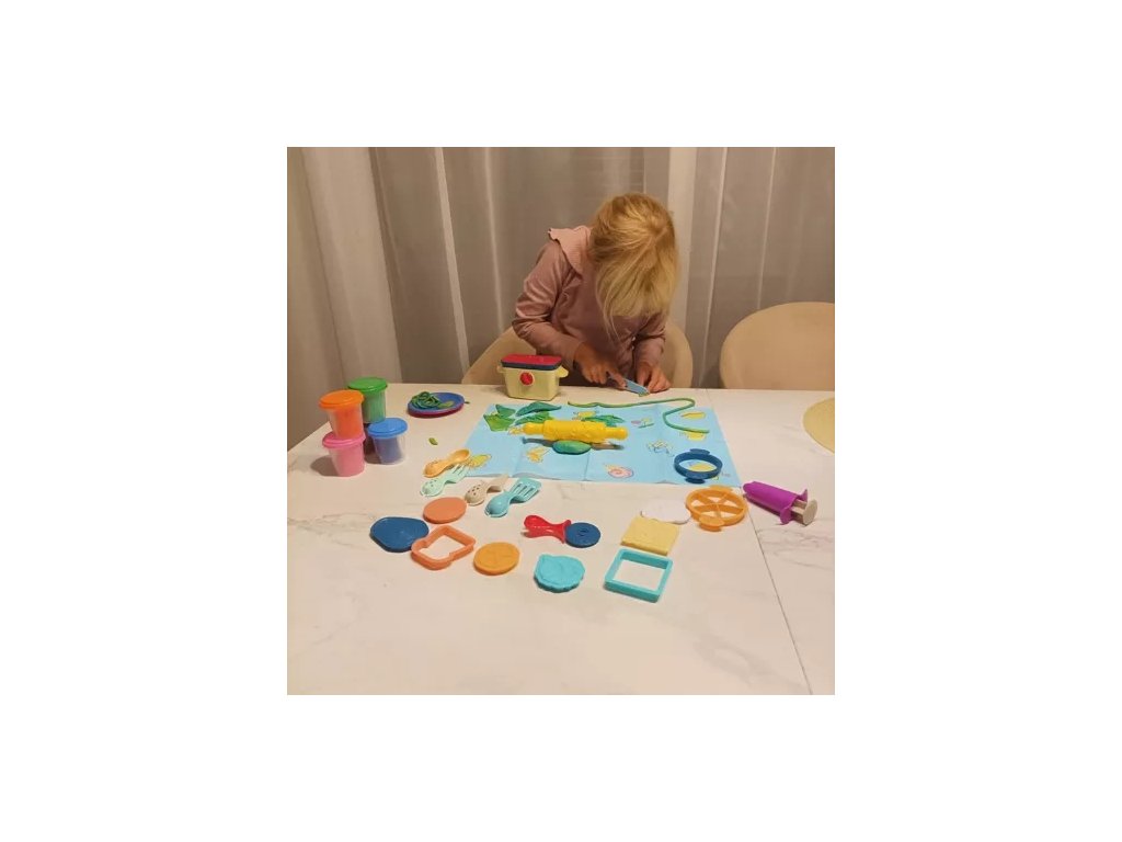 - VELMI VELKÉ MNOŽSTVÍ PŘÍSLUŠENSTVÍ – sada obsahuje mimo jiné trezor: nůž, vidlička, lžíce, talíře, váleček se vzory, imitace pizzy, vejce, hovězí sýr, stříkačka na vymačkávání hmoty a vykrajovátka na pizzu. Díky těmto doplňkům může vaše dítě vytvořit spoustu věcí z plastelíny. Od jídla po zvířata a lidi. Jsou omezeny pouze vaší představivostí.