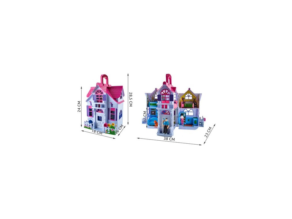 - SPECIFIKACE - rozměry: 16 x 18 x 28,5cm; rozměry rozloženého domečku: 23 x 38 x 28,5 cm; hmotnost: 0,69 kg; hmotnost s obalem: 0,926 kg; materiál: HIPS