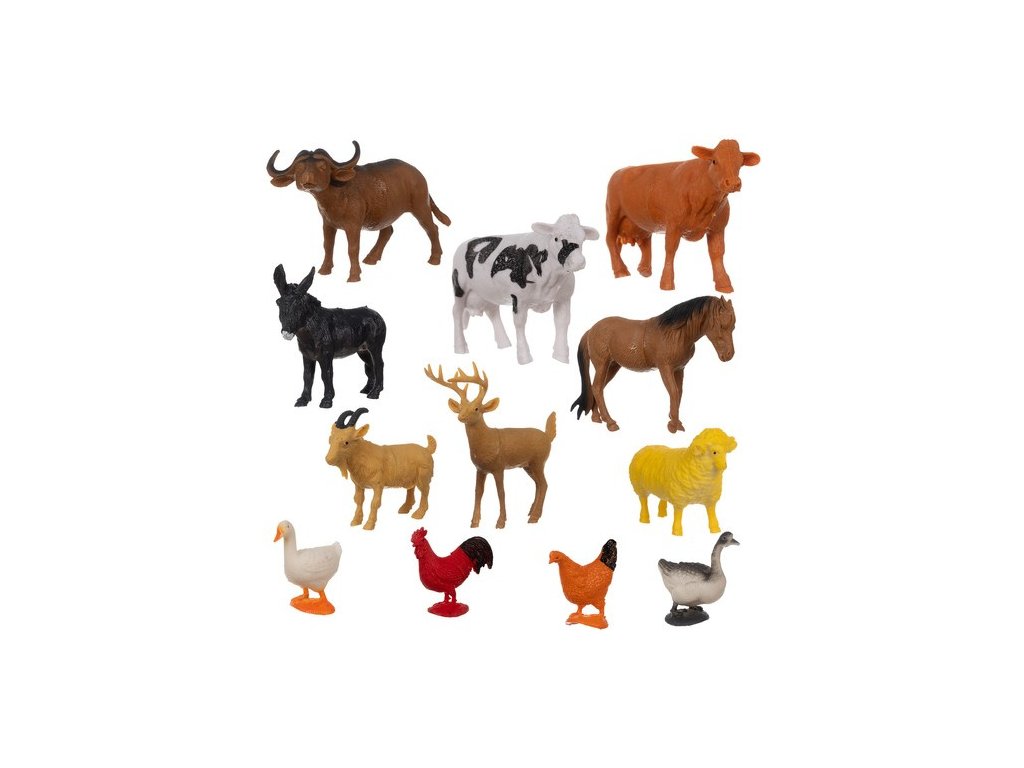 Včetně 12 hospodářských zvířat – Sada obsahuje 12 figurek zvířátek: ovce, kůň, 2 různá plemena krav, koza, osel, slepice, kachna, buvol, husa, kohout, jelen