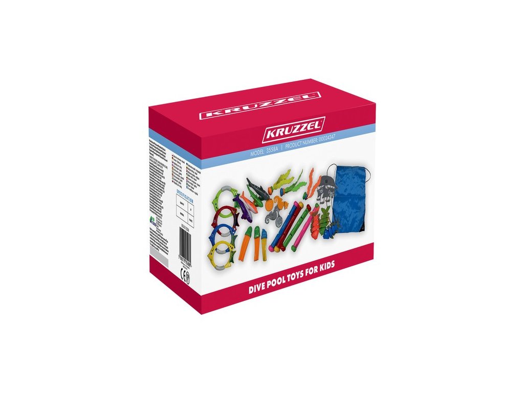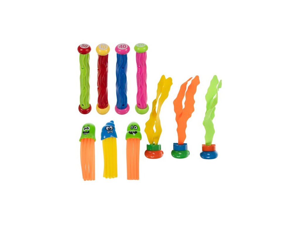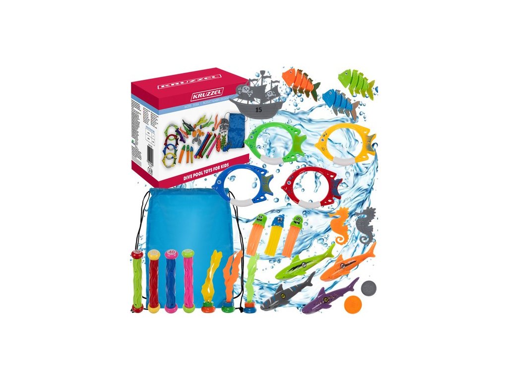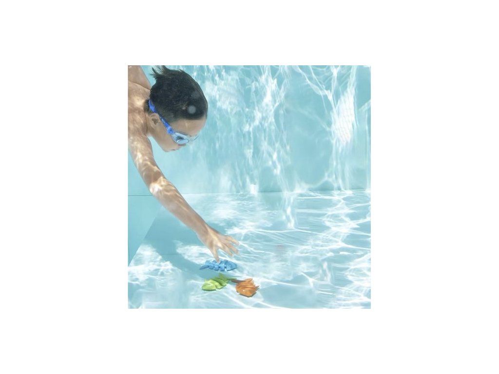 - HRAČKY NA HLEDÁNÍ POD VODOU - sada obsahuje 4 velké barevné ryby vyrobeno z PP, který klesají ke dnu po vhození do vody, pohybující se pohybem vody . Na jejich ocasech jsou bodové značky , které umožňují vstup prvky soutěže při potápění. Navíc jsou součástí sady 3 menší ryby z PVC , perfektní ladí se zbytkem sady a poskytují ještě více zábavy. 4 torpéda ve tvaru žraloka , vyrobené z PVC , s označením pod hřbetní ploutví , jsou ideální pro házení a chytání pod vodou . Jejich aerodynamický tvar umožňuje rychlý pohyb ve vodě , což z nich dělá oblíbený prvek zábavy při potápění.