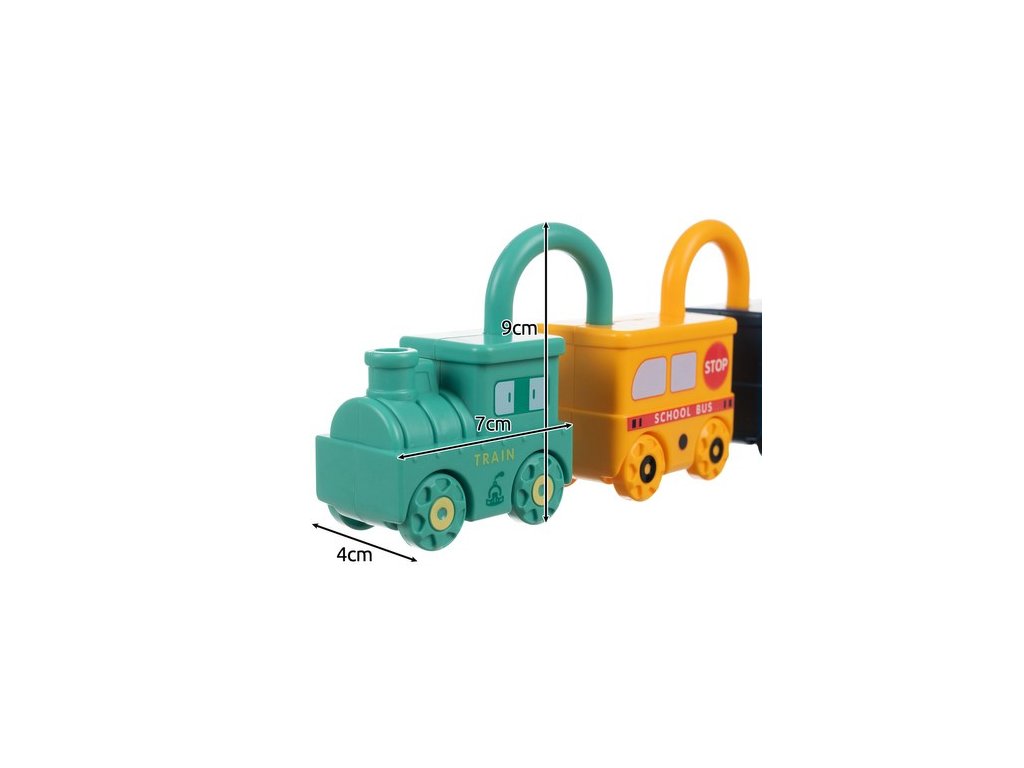 - KOMBINOVÁNÍ VOZIDEL - autíčka mohou být jednotlivá vozidla a díky pohyblivé rukojeti otočné o 360 stupňů , lze je kombinovat a vytvořit tak dlouhý vlak s vagóny. Po otevření visacích zámků pomocí příslušných klíčů mohou děti spojte vozidla ve správném pořadí a vytvořte dlouhou řadu. To je forma zábavy stimuluje dětskou fantazii a zároveň učí logickému myšlení a řazení podle objednávky.