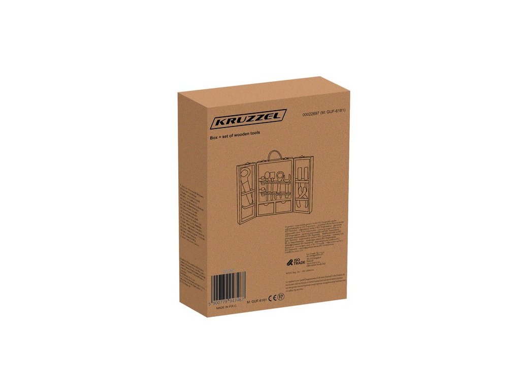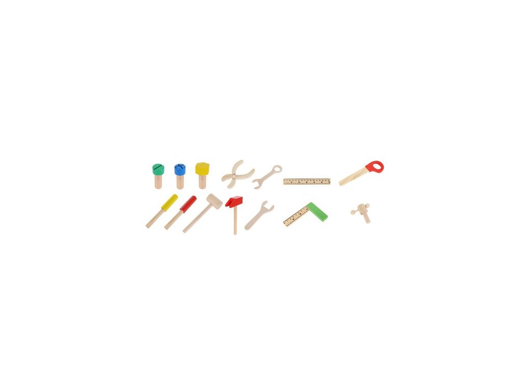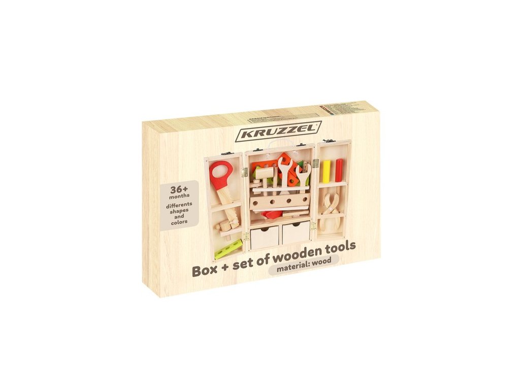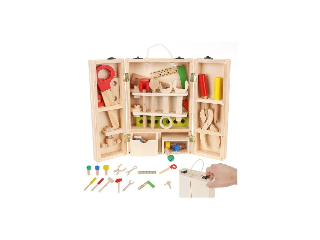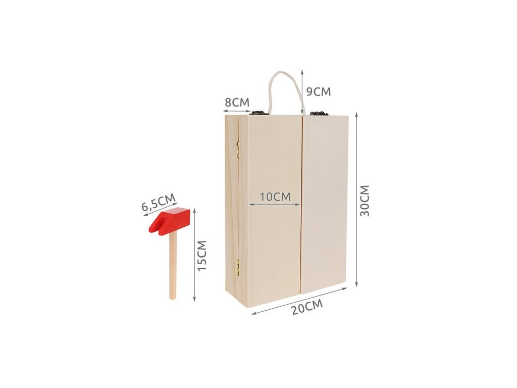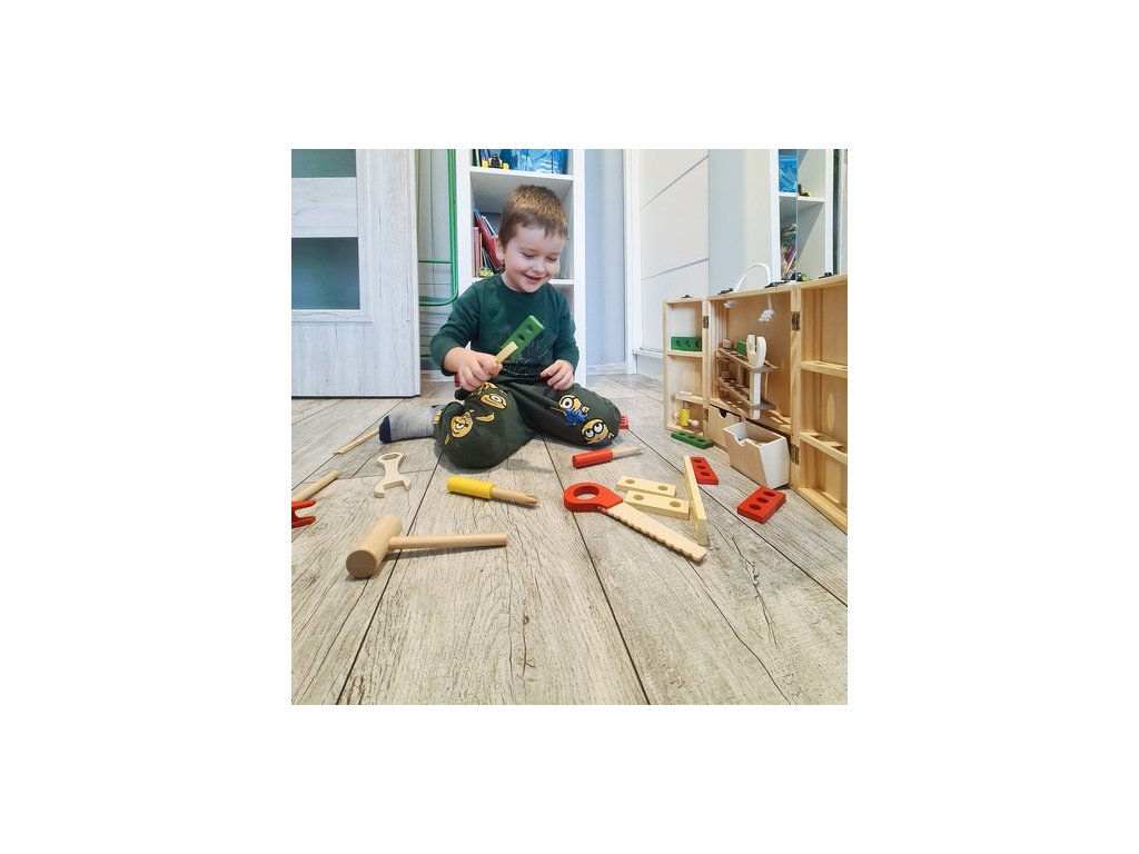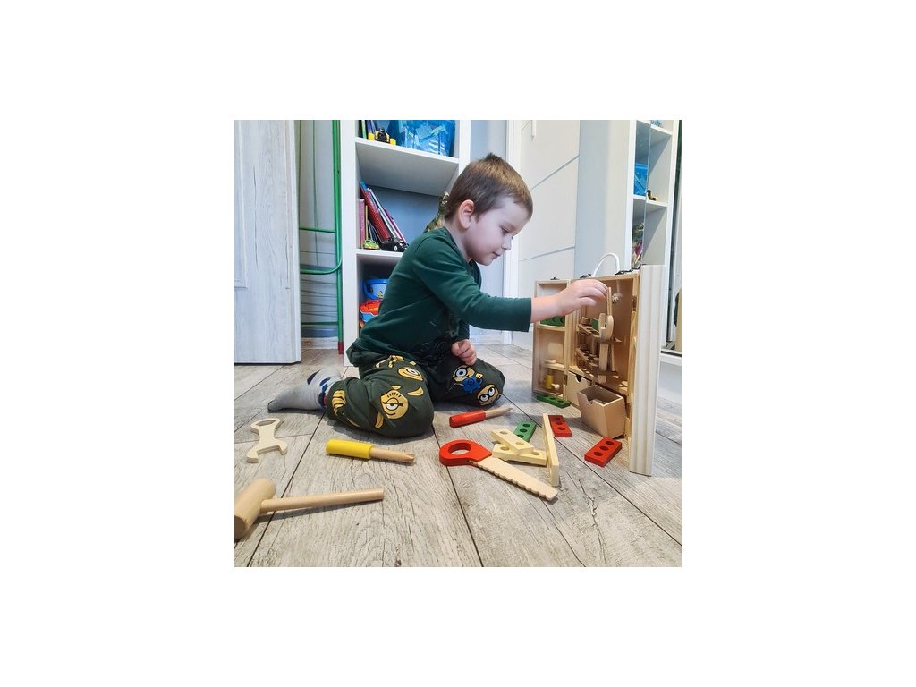 - BOX NA NÁŘADÍ – Sada obsahuje krabici a příslušenství jako jsou: šrouby, matice, pilka, kladiva, desky s otvory, šroubováky, kleště, pravítko a úhelník. Box má také pohodlné madlo ze silného provázku. Uvnitř krabice je mnoho přihrádek a míst pro umístění všech nástrojů. Hračka je vyrobena ze dřeva a natřena barvou, která je bezpečná pro zdraví batolete.