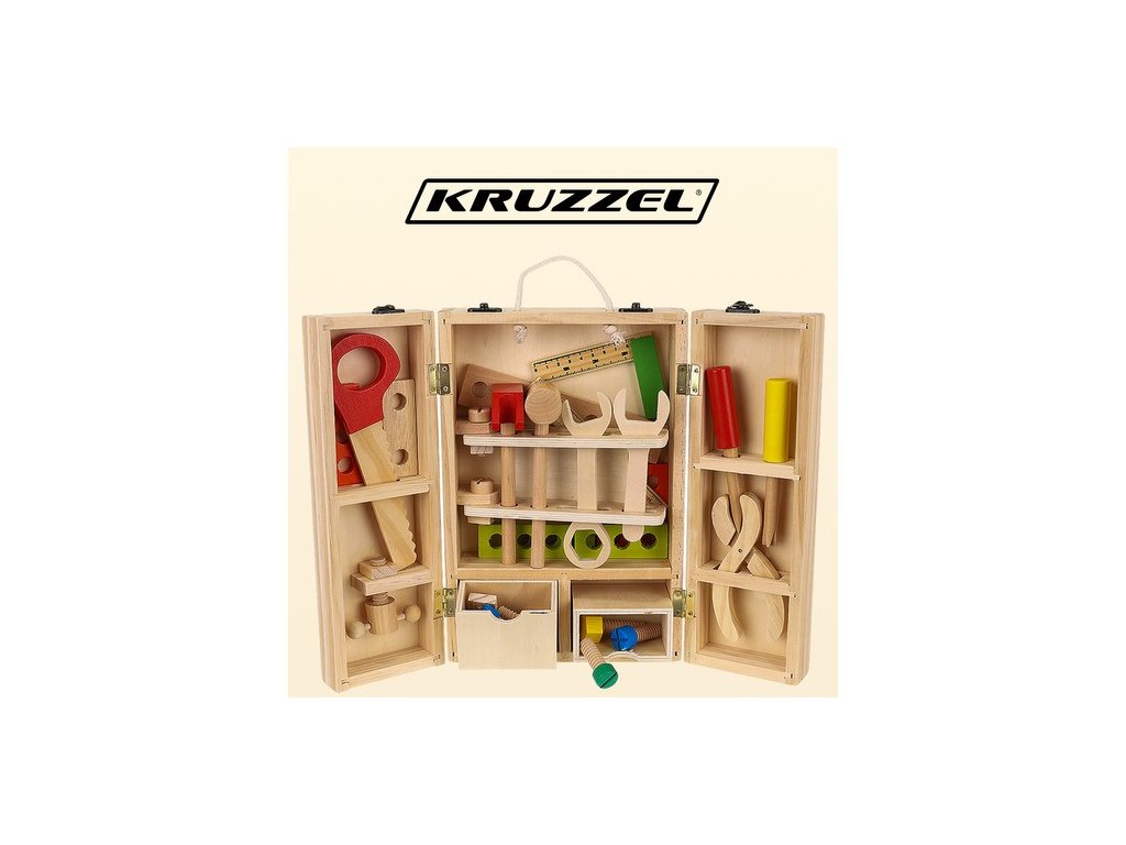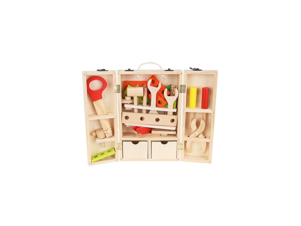 Sada pro malého kutila se skládá z tradičního nářadí s příslušenstvím v uzavřené krabičce. Uvnitř dřevěného pouzdra je mnoho přihrádek, kam si vaše batole může uspořádat doplňky.