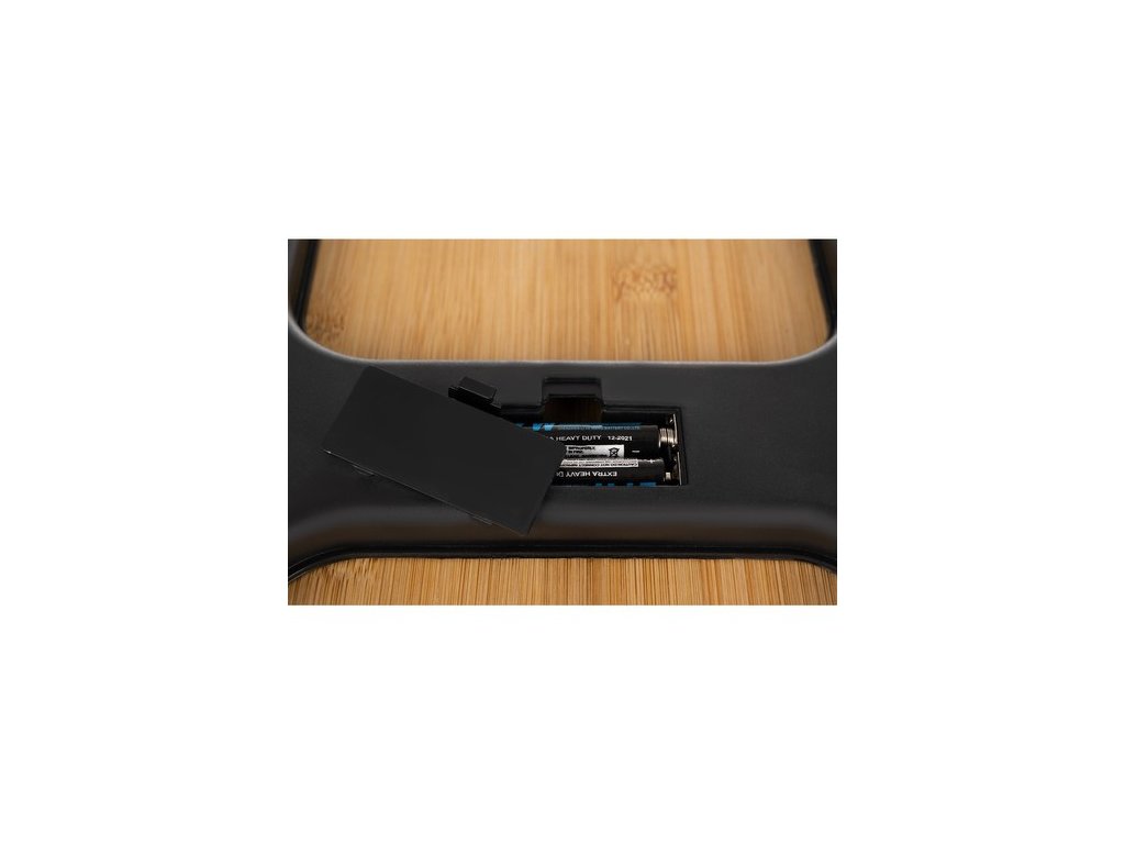 - AUTOMATICKÉ VYPNUTÍ – bambusová LCD váha má možnost automatického vypnutí po 8 sekundách , což šetří energii a zvyšuje pohodlí při používání. Zařízení je napájeno 2 AAA bateriemi a má indikátor nabití baterie .