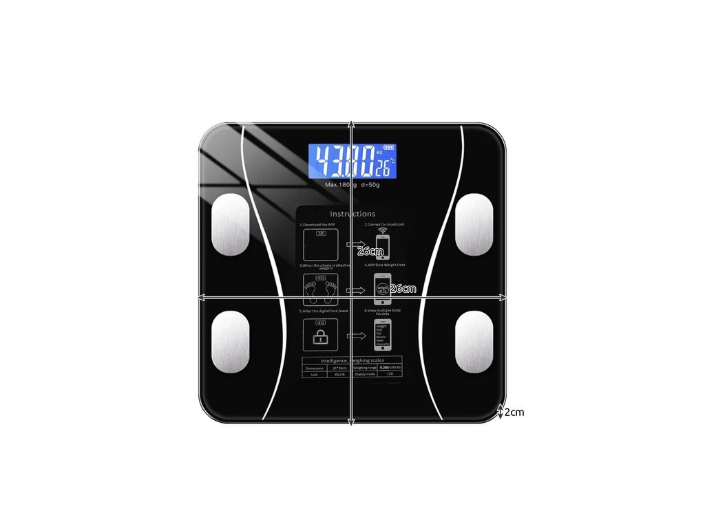 - SPECIFIKACE - Černá barva; přípustná hmotnost měření: do 180 kg; napájení: 2 x AAA (součástí balení); rozměry: 26 x 26 x 2,2cm; hmotnost: 0,900 kg; hmotnost s obalem: 1 050 kg.